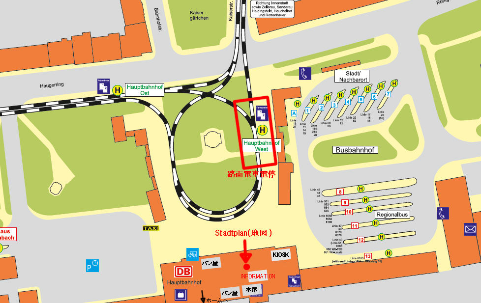 5つの路線があり、中央駅から街中へ出るには、1,3,5の乗ると良い。