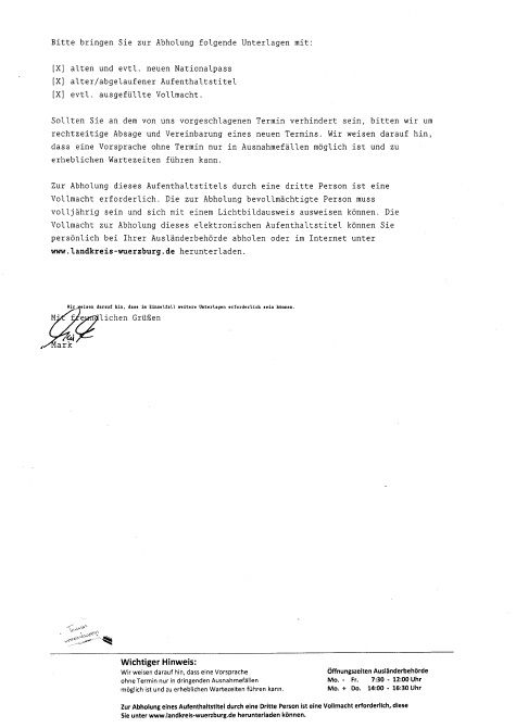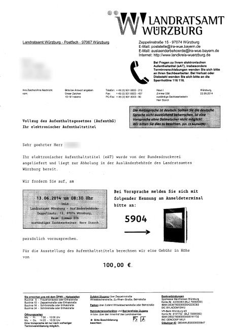 7) 指定日時にLandratsamtへ行き、費用を支払い、e-AT(滞在許可証)を受領して完了。