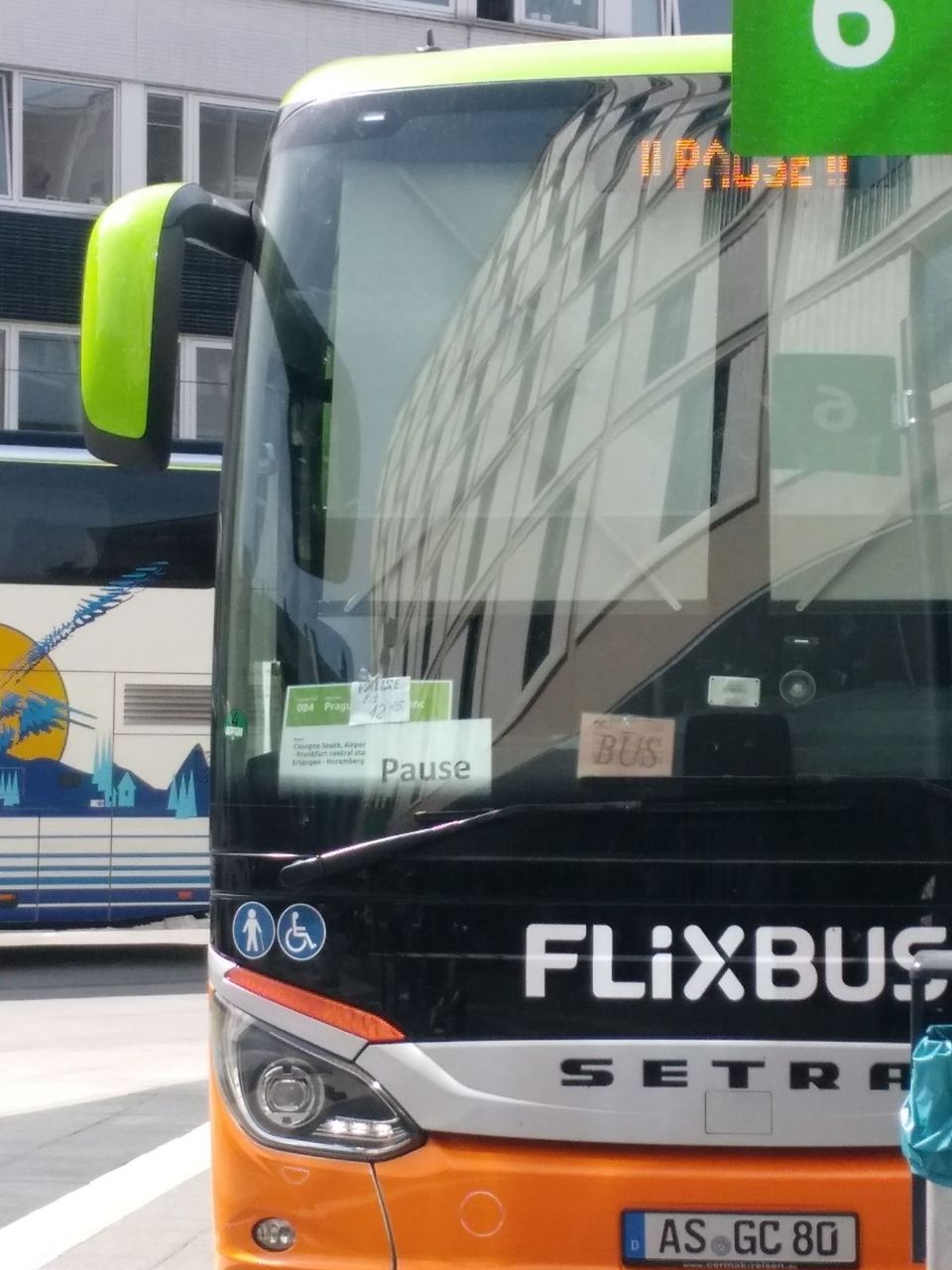 これはフランクフルトからヴュルツブルグへ向かう際のフランクフルトバスターミナルでの出来事。定刻通りに来たFLIX BUS。が、運転手が乗客に向かって叫んでいる。聞くと"45分の休憩に入るから待機。"と。ある客が理由を聞いていたが "法律で決まっているんだ" と強い口調。そのため、暑い夏の日中に、バスに乗ることも出来ず外で待機する羽目に。日本人からするとあり得ないのだが、ドイツ(いや日本以外)ではありうる。まぁ、次の 2)事故 のような状況になるよりはもちろん良いんだけど。。。写真のように"Pause;休憩" の表示と手書きの時間 "bis 12:15;12時15分まで" の表示が。こんなこともあるのが高速バス。