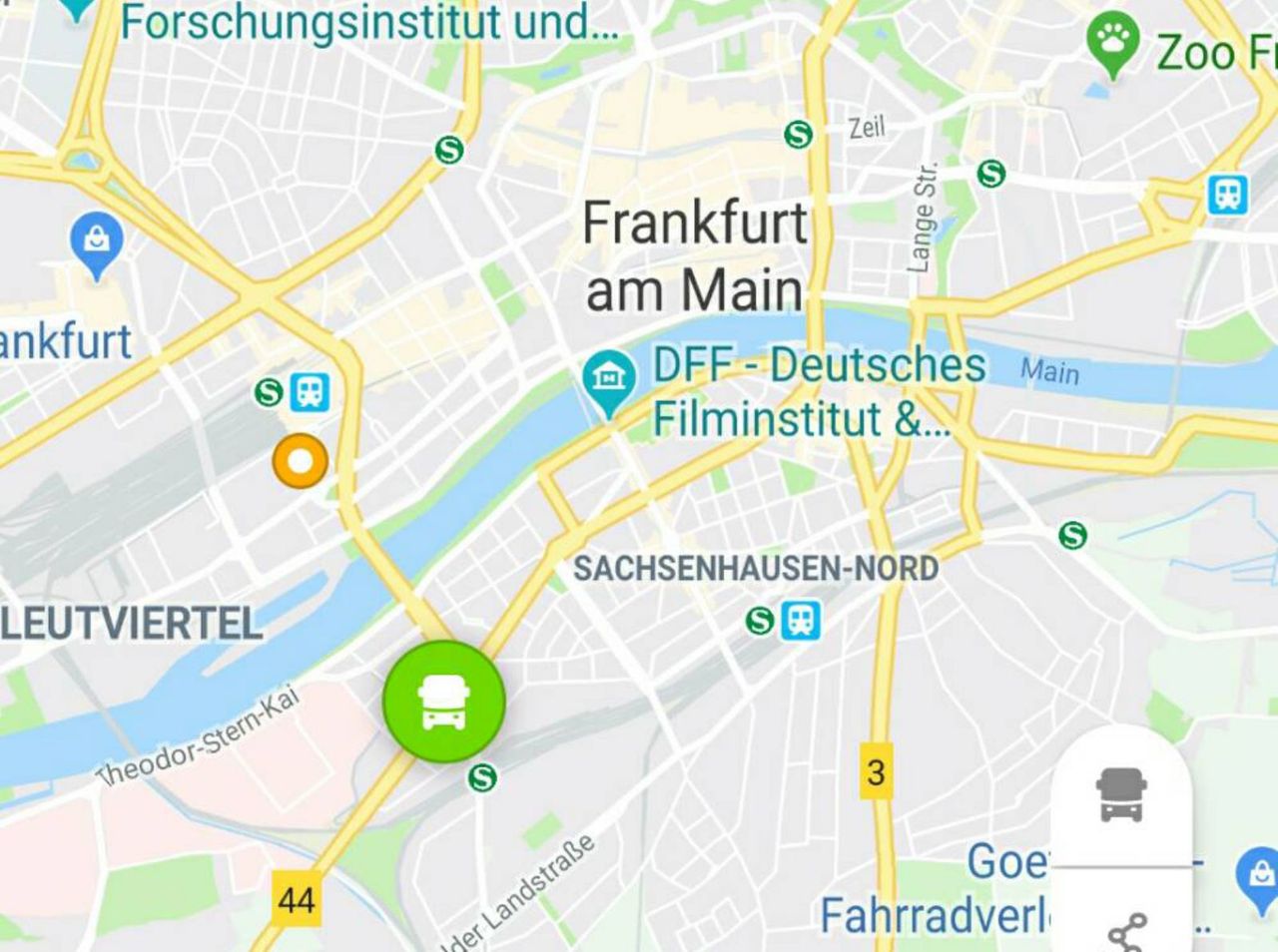 オレンジ丸が自分の場所、緑のバスマークがバスの現在地。