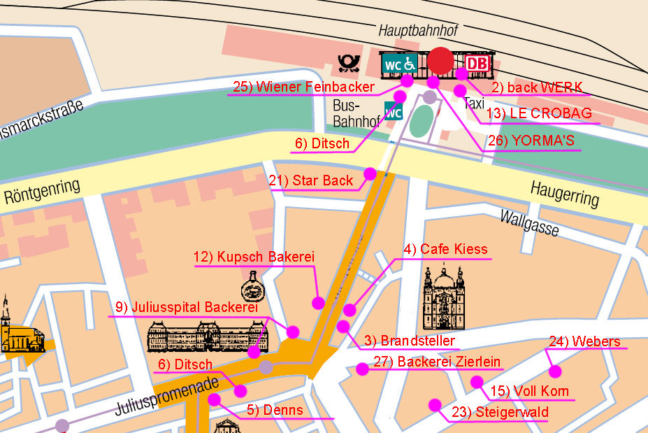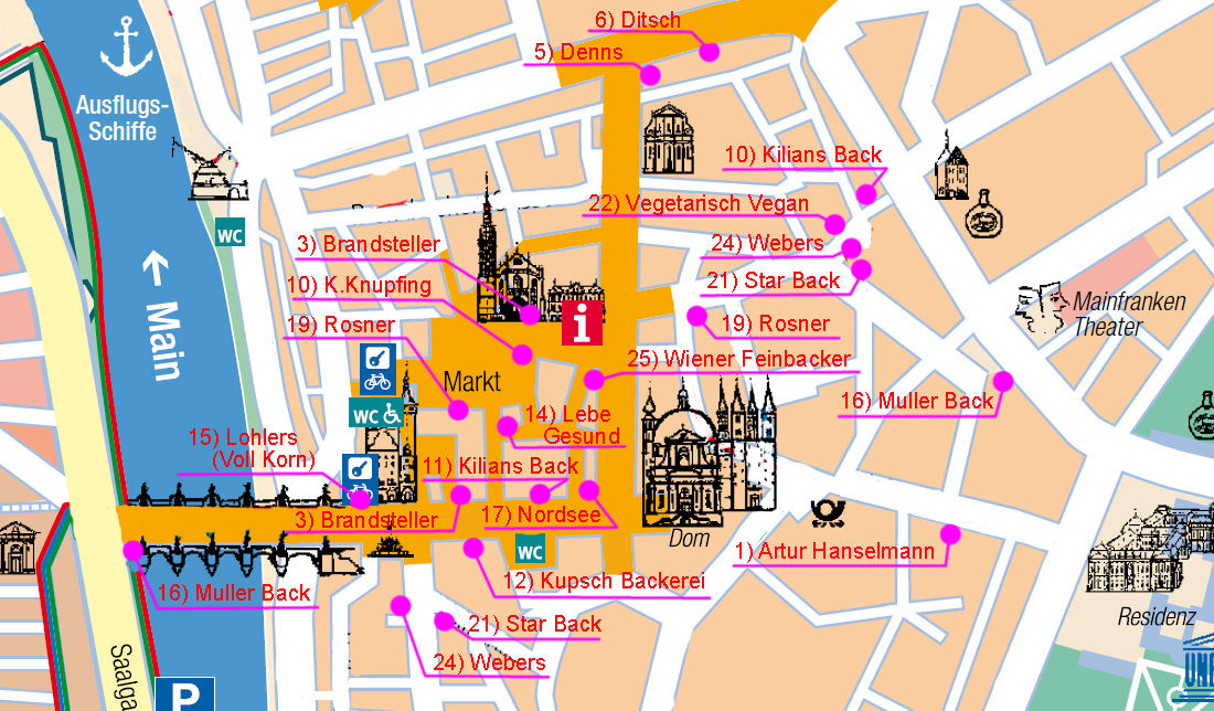 ヴュルツブルグの旧市街にあるパン屋マップ。(パン屋の詳細は、 2)パン屋リスト を参照。)