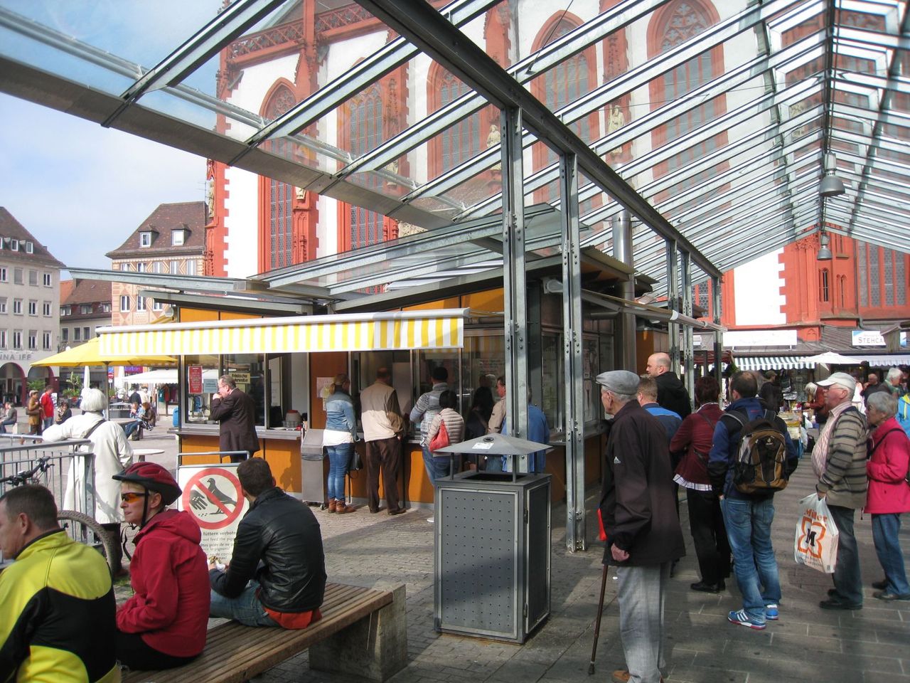 Markt Platz:マルクト広場のマーケット内にある焼ソーセージのお店。昼は観光客でにぎわっている。Würzburger Bratwurst mit Brotchenを頼むと写真のものが食べられる。パンはこの手のサンドで通常使われる普通のパン。(たぶん冷凍パン)。ソーセージはなかなかジューシーで美味しい。レベルとしては、他の街でも食べられるレベルなので普通かと。その他、魚メニューもある。