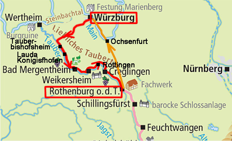距離としては、ヴュルツブルグ〜Tauberbishofsheim:タウバービショフスハイムまで約50km。そこからタウバー川沿いにローテンブルグまで約75km。帰りはなるべく直線的に道を選んで70km程。