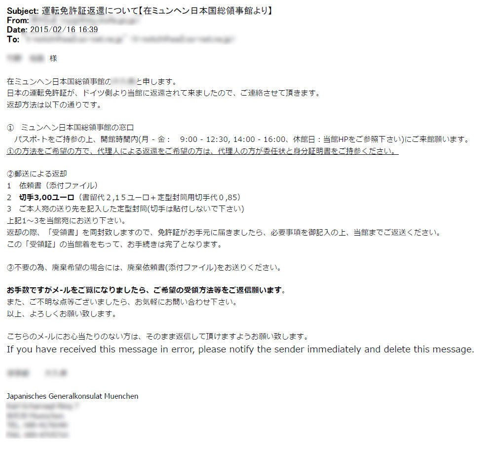 2015ǯ2·î17Æü¡¢¥ß¥å¥ó¥Ø¥ó¤ÎÎλö´Û¤«¤éÌȵö¾ÚÊֵѤΥ᡼¥ë¤ò¼õÎΤ·¤¿¤Î¤Ç¡¢»ØÄêÄ̤ꡢ°ÍÍê½ñ¡¦ÊÖµÑÍÑÉõÅû¤òÁ÷ÉÕ¡£