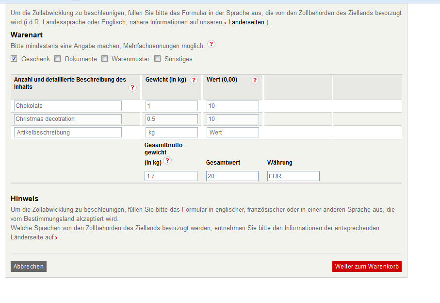 ¢ ÆâÍÆÊª¤Ë¤Ä¤¤¤Æ¡§¾¦ÉÊ̾¤Ï±Ñ¸ì¤Ç¤ÎµÆþ¤Ç²Ä¡£¤µ¤é¤ËGewicht¡Ê½ÅÎ̡ˡ¢Wert¡Ê²Á³Ê¡Ë¡¢GesamtbruttogewichtÈ¢¤ò´Þ¤á¤¿Áí½ÅÎÌ¡¢Währung¡ÊÄÌ²ß¡Ë ¤òÆþÎÏ¡£