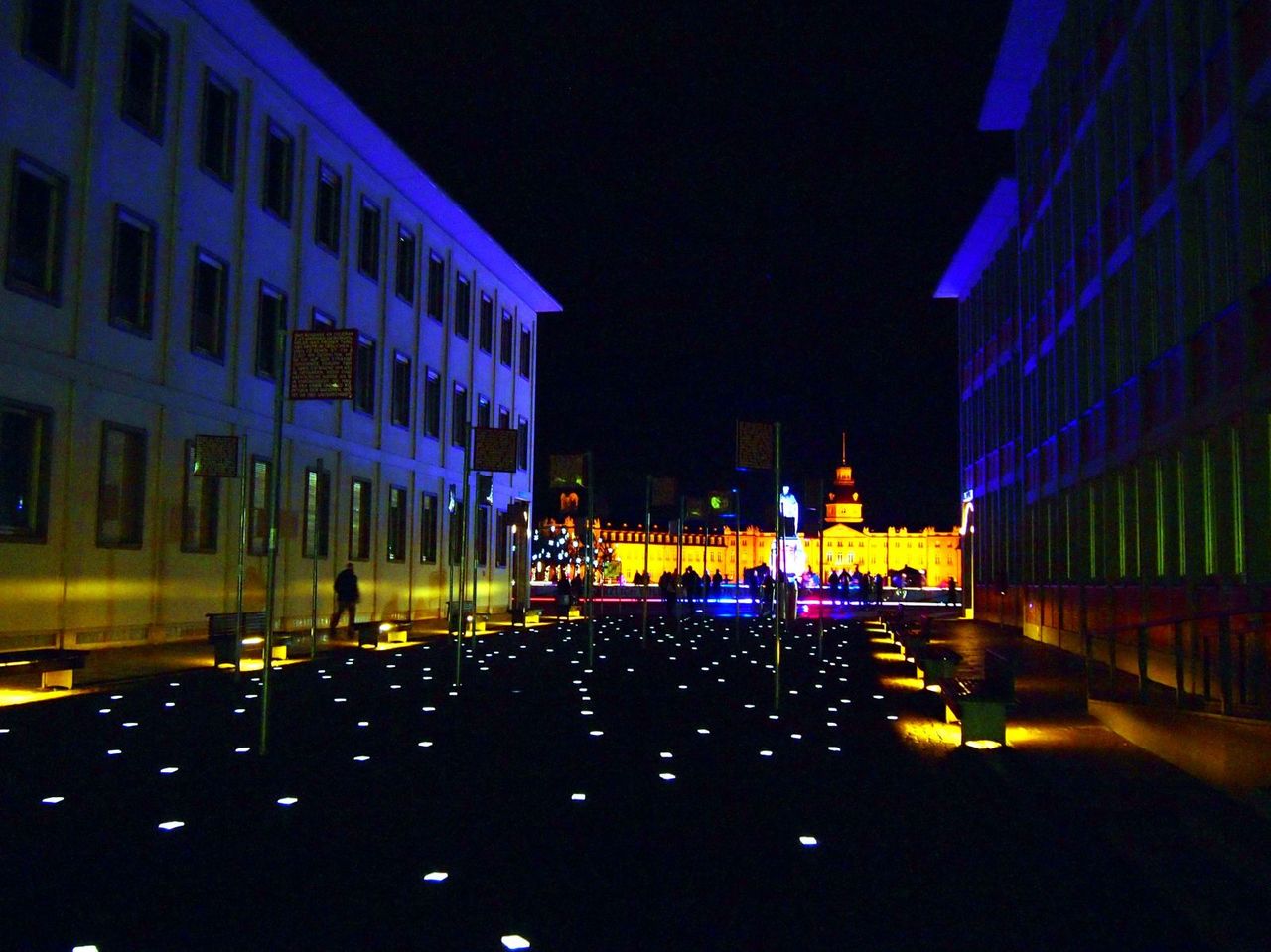 2枚目写真で見ると円状になった道が良くわかる。元々、このKarlsruheは、KarlsさんがRuhe:休息するための街だったらしい。Karlsさんとは"カール3世ヴィルヘルム"の事らしく、この街の設計も彼が主導でやったのだとか。この円の中心には宮殿が建っており、放射状に道が延びているため、街の色々なところから宮殿を望むことができるのが面白い所。(昼間の街並みについては、別途アップ予定。)
