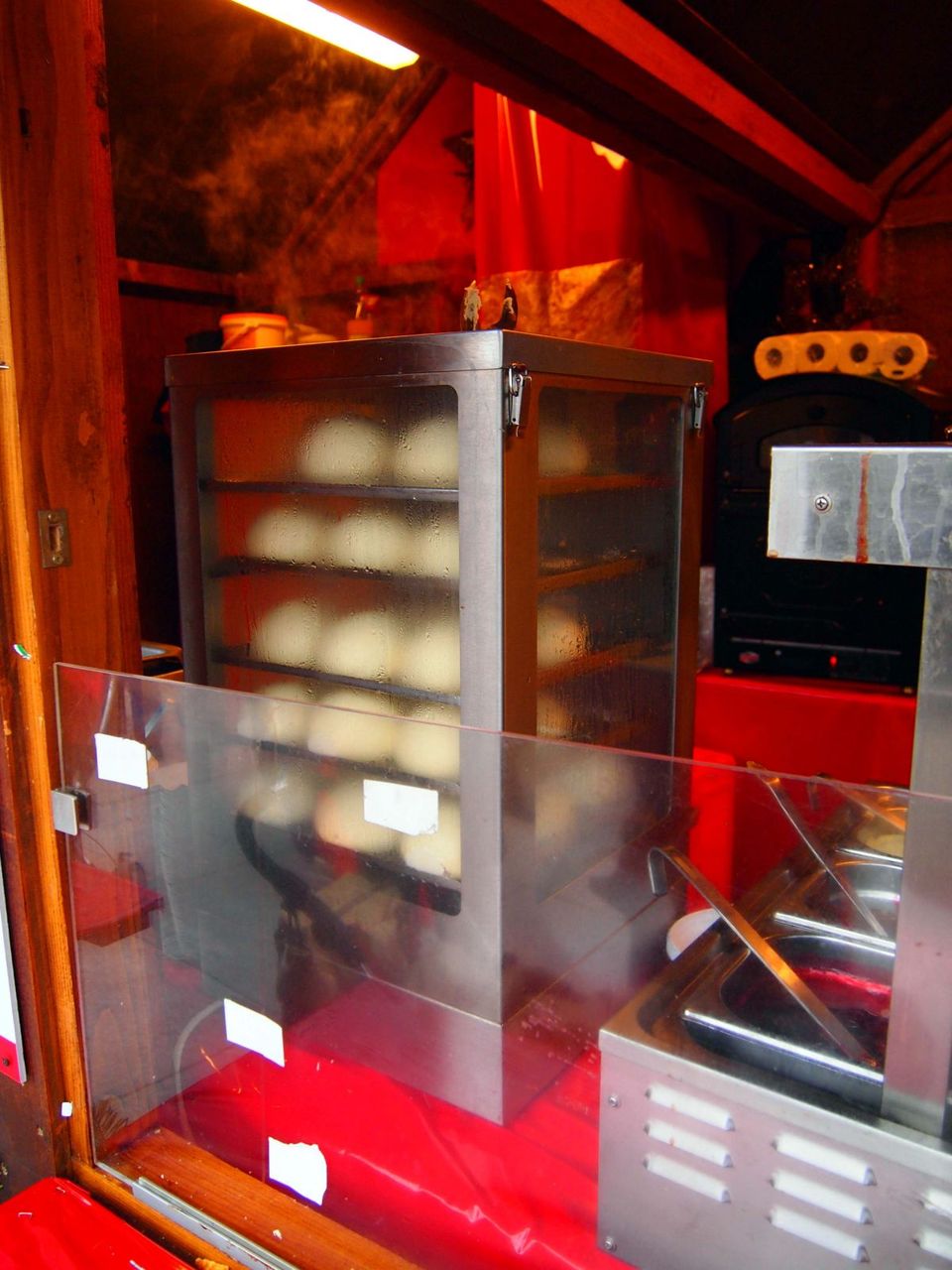 ニュルンベルグで見かけて、気になっていた食べ物。肉まん??と思ってしまうガラス容器と、見た目。名前は"Dampfnudel(蒸し麺)"。なぜ"麺"なのかはわからないが、、生地は肉まんそのもの。ただし、3枚目写真でわかるように、中には何も入っていない。そして、ソースは"Sauerkirchen(さくらんぼ)"。要するに、甘酸っぱいソースで食べる肉まんの生地。これはこれで、なかなか美味しかったが、、、寒かったこともあり、肉まんが無性に食べたくなってしまった。。