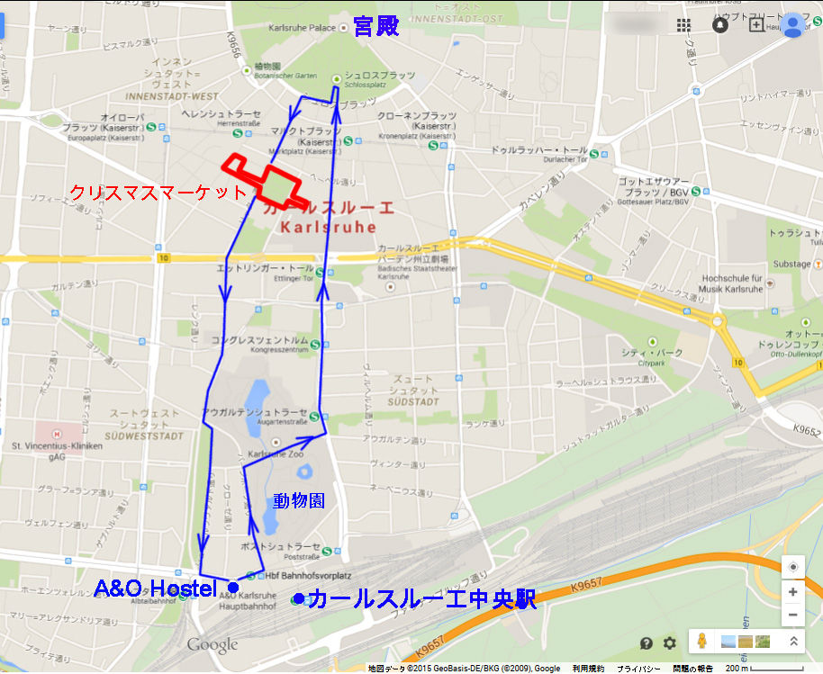 そんなKarlsruheのクリスマスマーケットは、駅から宮殿方向へ歩いて20分くらいのところにある広場で行われている。トラムの場合は、1回券"Einzelkarte"が€1.80、4回券"4-er Karte"が€6.90。また、宮殿がライトアップされており、スケートリンクも開かれている。(なお、現在、Markt広場が大体的な工事を行っており、、もしかすると普段はMarkt広場でやっているのかもしれないので2015年以降は再度確認を。)