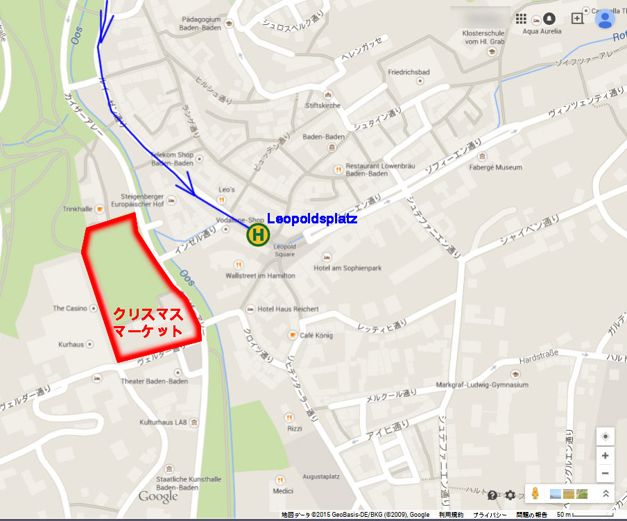 Karlsruheから南に30km程、Schwarzwald"黒い森"にある温泉保養地であるが、電車の駅(Baden Baden)からは少し離れた所に街の中心部がある。クリスマスマーケットは中心部の公園にて開催されている。(ここの街並みについても別途アップ予定。)
