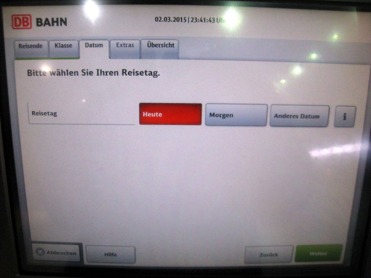 写真3枚目:旅行日を選択。今日:Heute、明日:Morgen、その他:Anderes Datum。