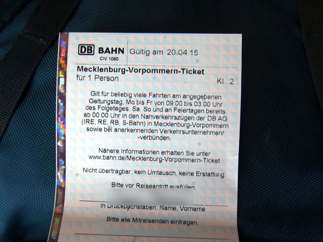 ¤³¤ÎÆü¤ÏLübeck¤Þ¤Ç¹Ô¤¯Í½Äê¤Ë¤·¤Æ¤¤¤¿¤Î¤Ç¡¢¾è¤êÊüÂê¥Á¥±¥Ã¥È¤ÎMecklenburg-Vorpommern Ticket¤ò¹ØÆþ¡£¡Ê¹ØÆþÊýË¡¤Ï¤³¤Á¤é¤Î¥Ð¥¤¥¨¥ë¥ó¥Á¥±¥Ã¥È¤ÈƱ¤¸¡£¡Ëgoogle map¤Ï¤³¤Á¤é¡£