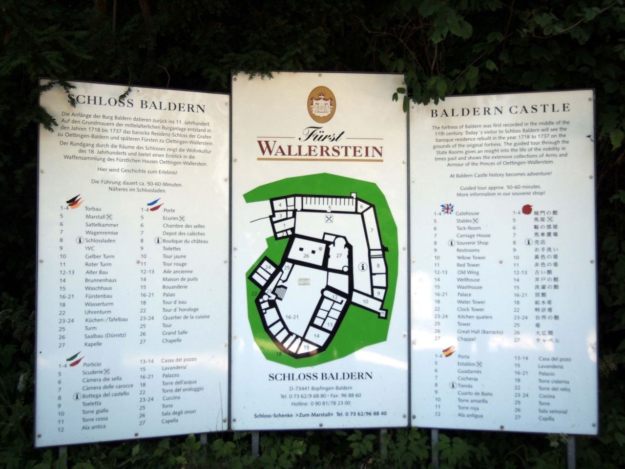 お城の城内地図によると、城内ツアーで小一時間ほどかけて、18世紀の部屋の様子を見せてくれるらしい。当時、Baldern伯爵やWallerstein侯爵のResidenz(居城)であったらしく、バロック様式の建物なども見ることができるらしい。日本語表記があるということは、日本人の割合が多いんだろうなぁ。(ロマンチック街道だから??)。