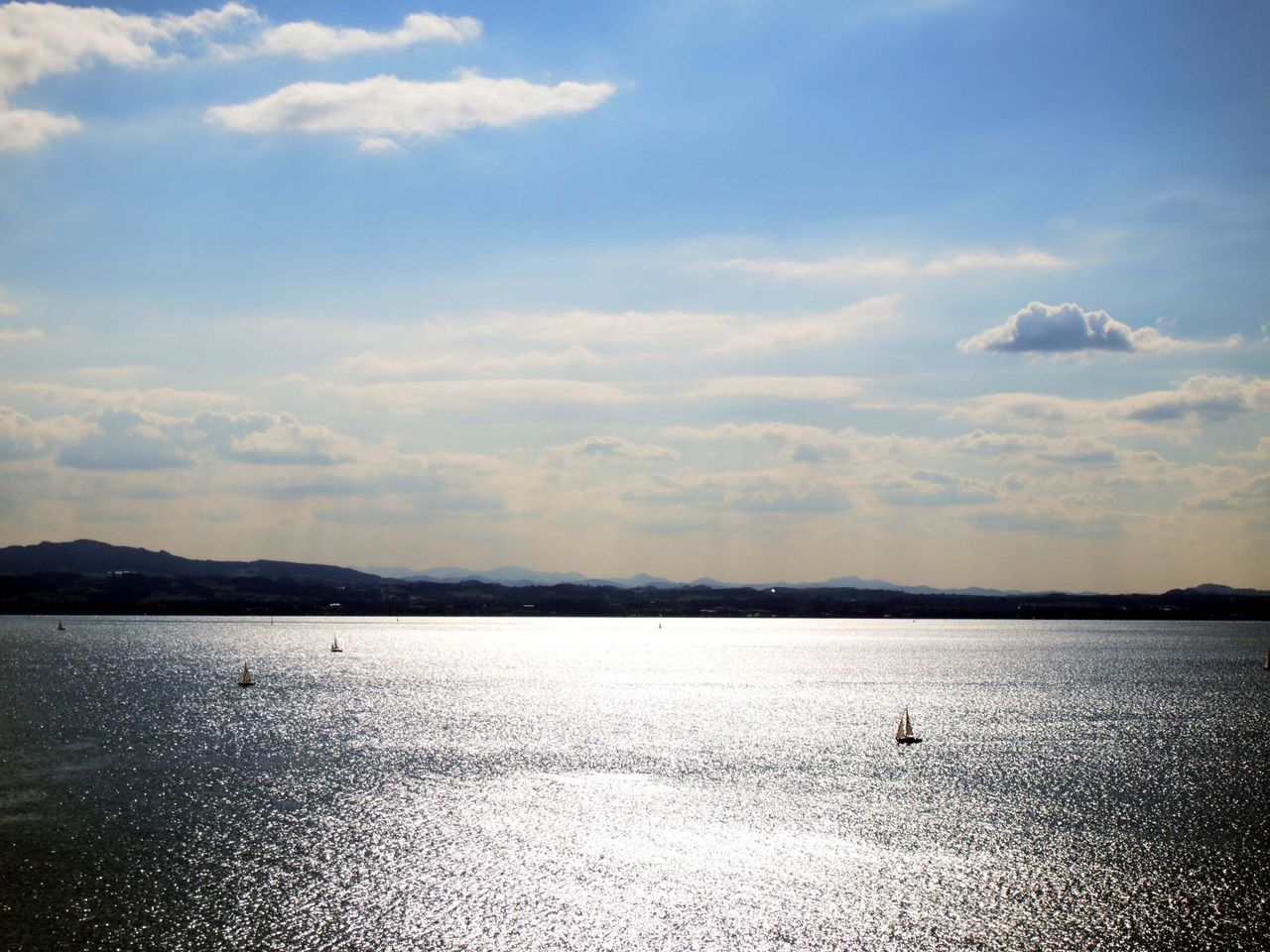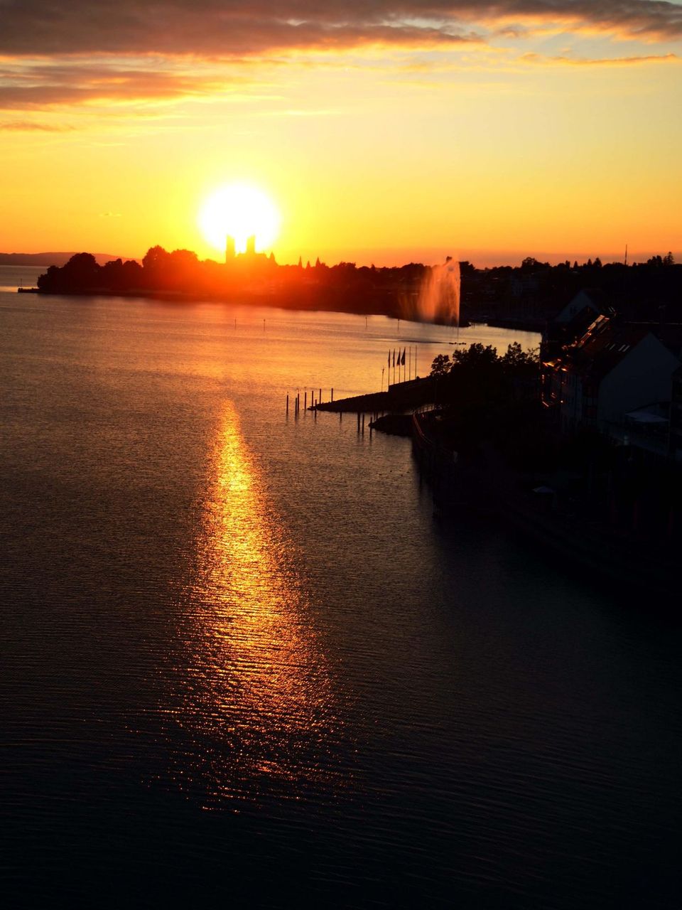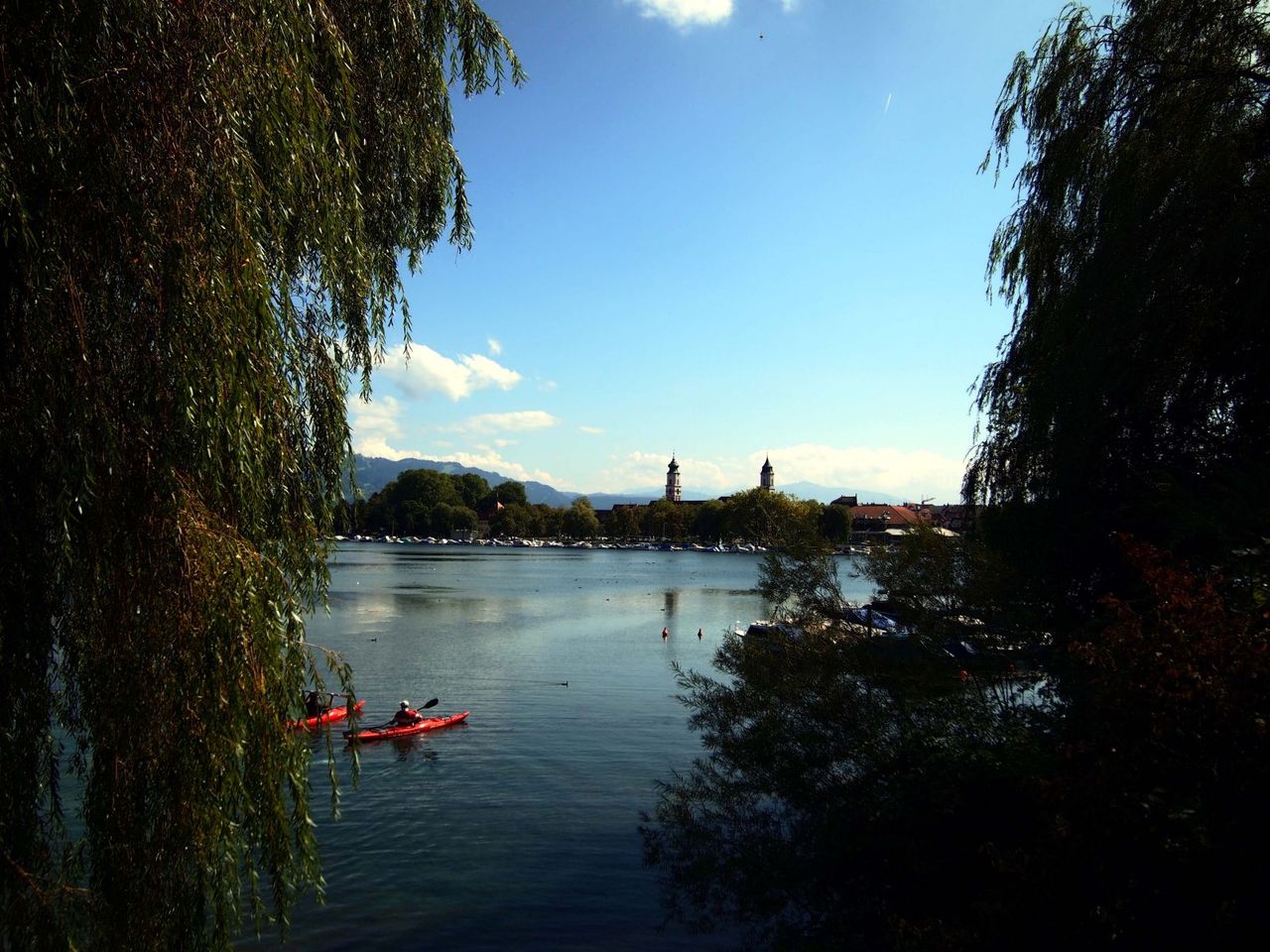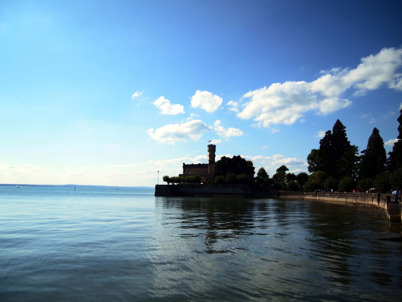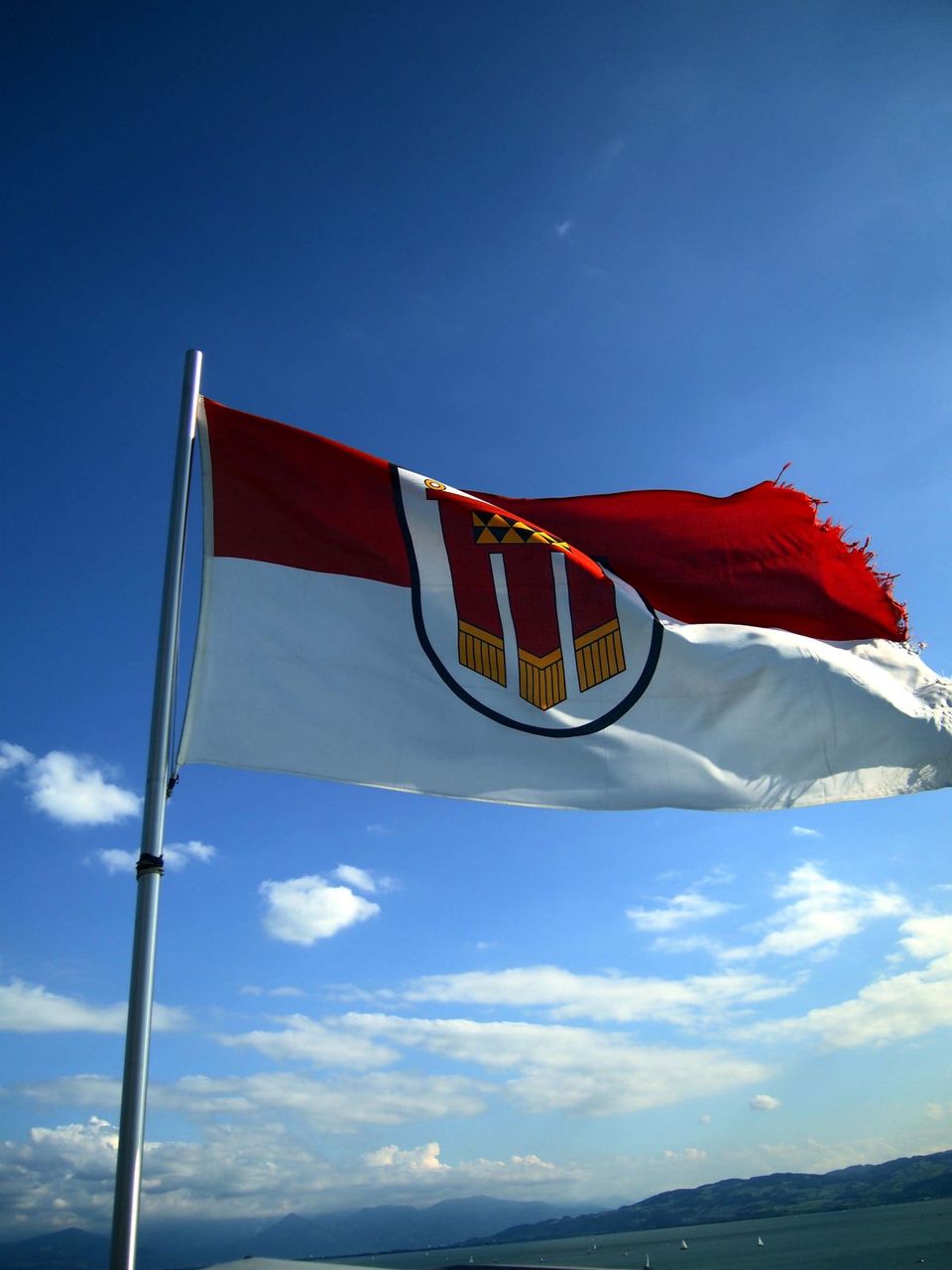 塔に登ると、太陽に輝く湖面と遠くに浮かぶヨット。湖岸に並ぶ静かな街並み。そしてたなびく旗。。平和だ。。