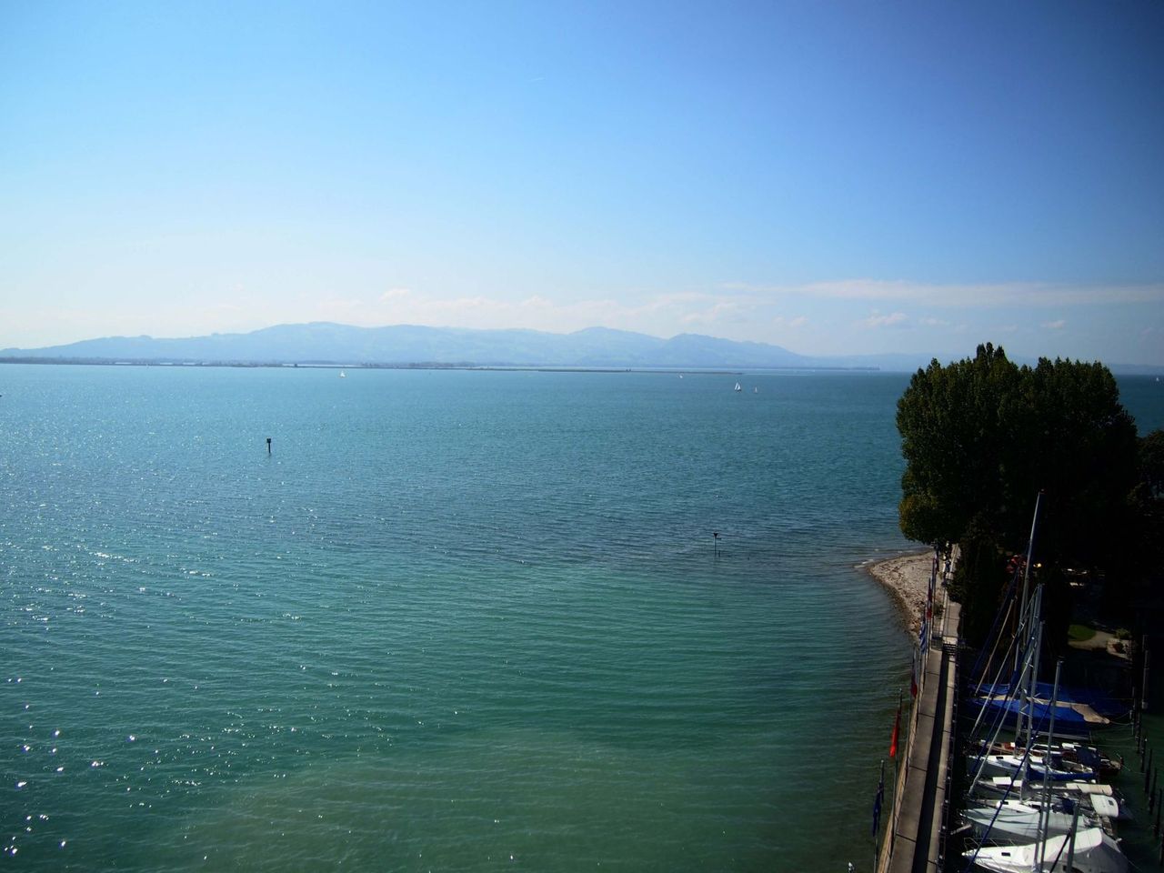 港にある灯台には登ることができる。上からの眺望はとてもすがすがしく、オーストリア、スイス、そして今日の目的地フリードリヒスハーフェン方向まで全て見渡すことができる。天気も最高で、水面がとても眩しい。