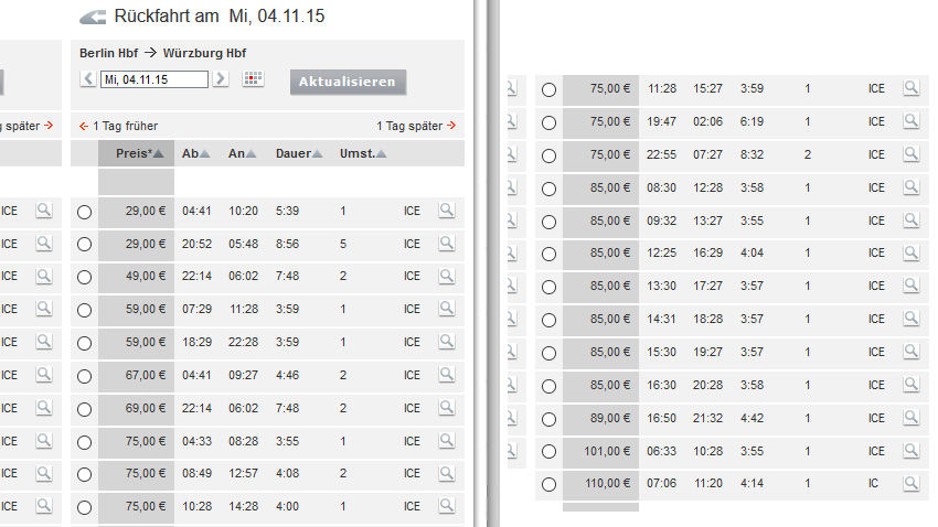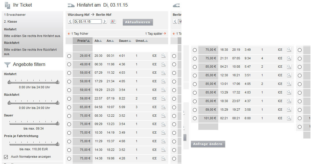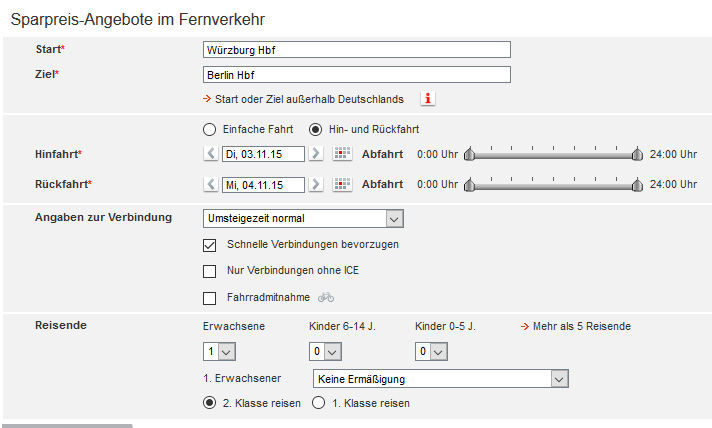 「ヴュルツブルグ」から「ベルリン」に、11月5日行、11月6日帰りで検索する場合の入力例。記入後、右下「Suchen」。