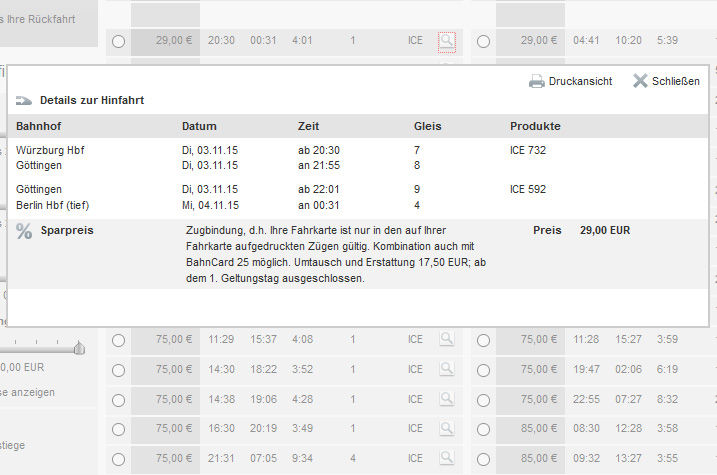 行きの検索結果。安い順に上からなので、20:30発が29€。乗換えの詳細は虫メガネマークをクリック(右写真)。ちなみに、"umst." は乗換え(umsteigen)回数。