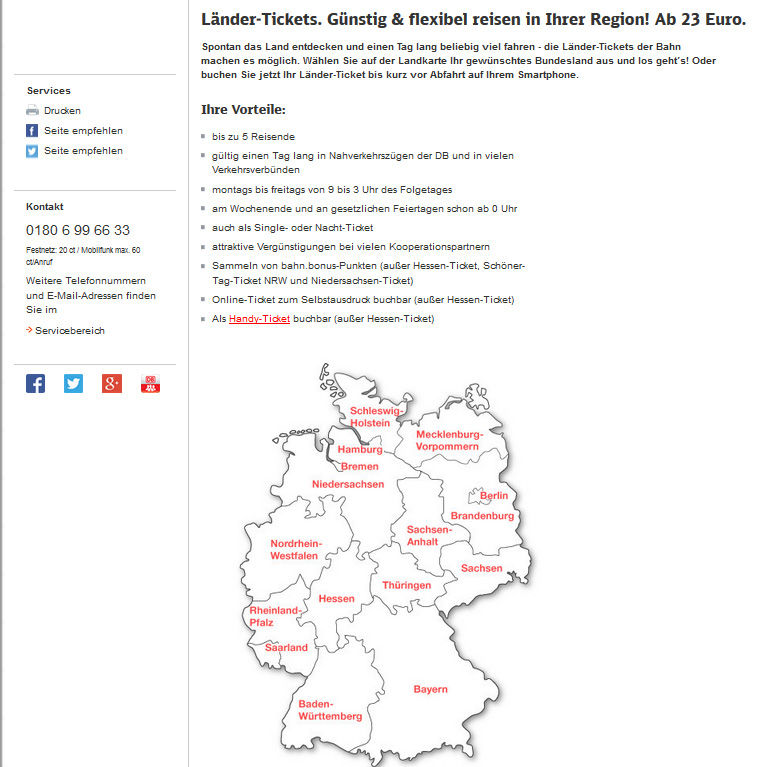 ・Niedersachsen-Ticket : ニーダーザクセン州、ブレーメン、ハンブルグ。使用エリアはこちら(PDF)。使用エリアはこちら(PDF)。