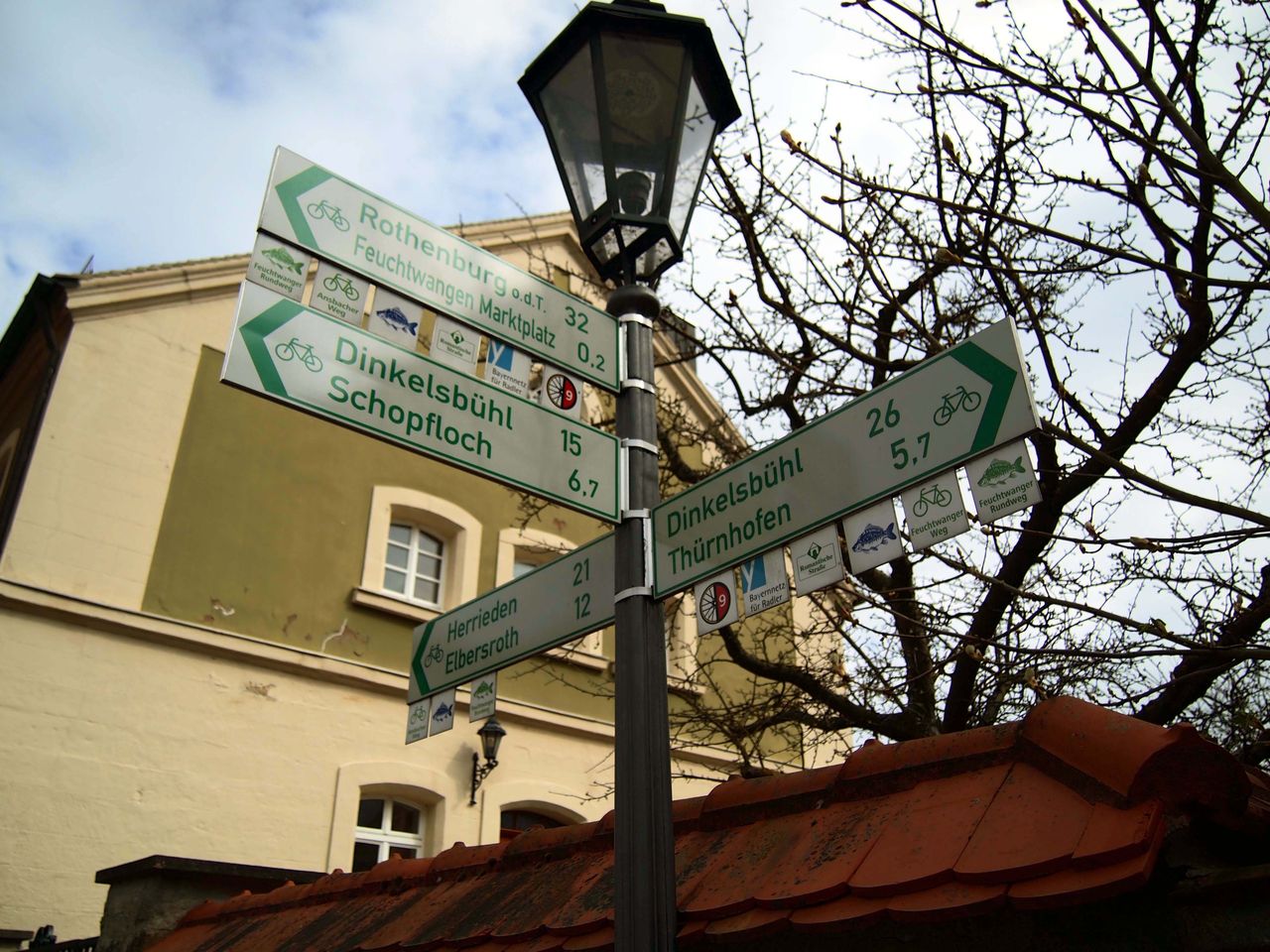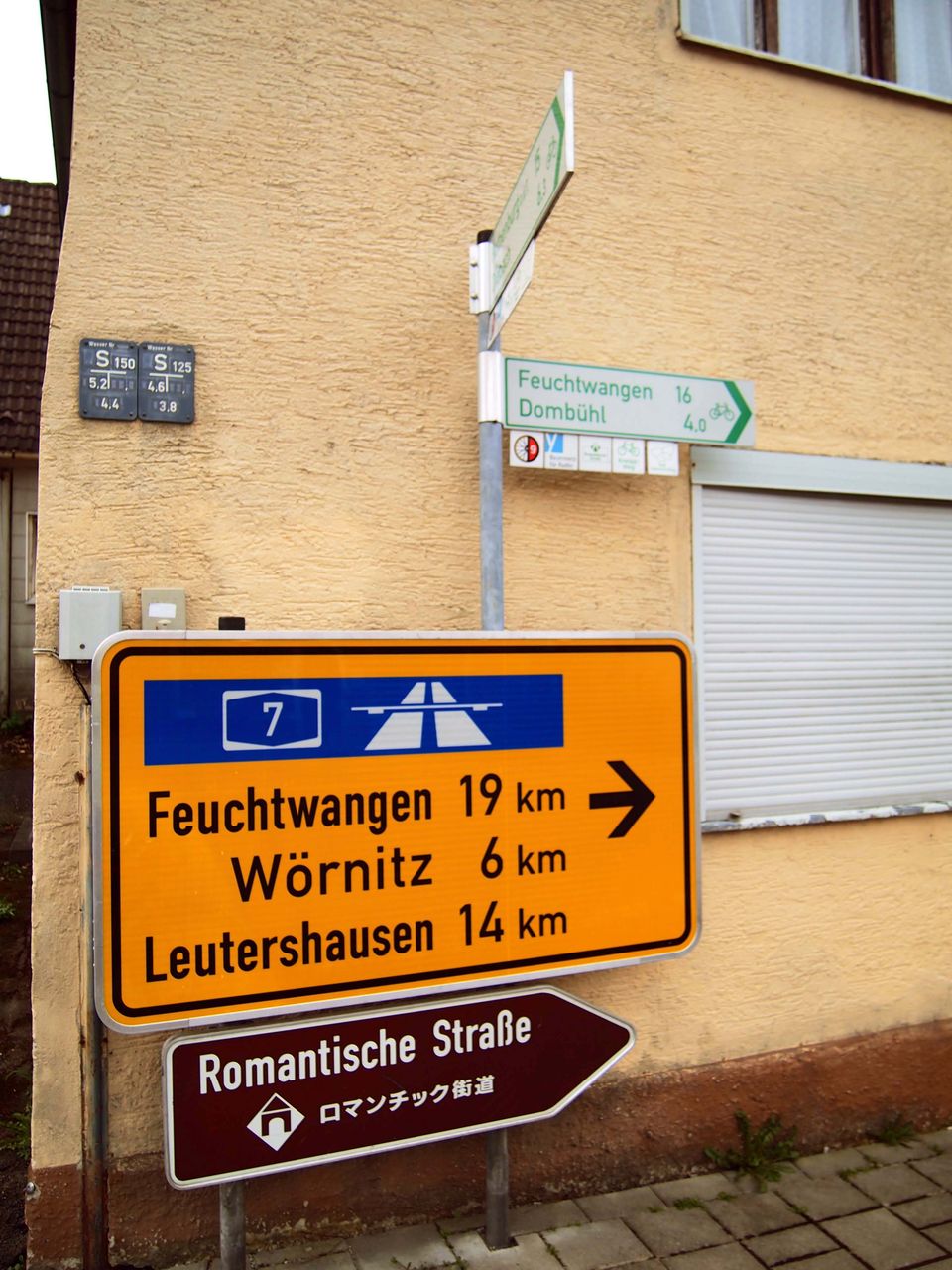 この看板を見るとディンケルスビュールまでは二つの道があり、左の道で行くと15km、右の道で行くと26km。ロマンティック街道は右なので、10km以上も遠回り。。。この道のりがなかなかアップダウンが多くて大変だった。