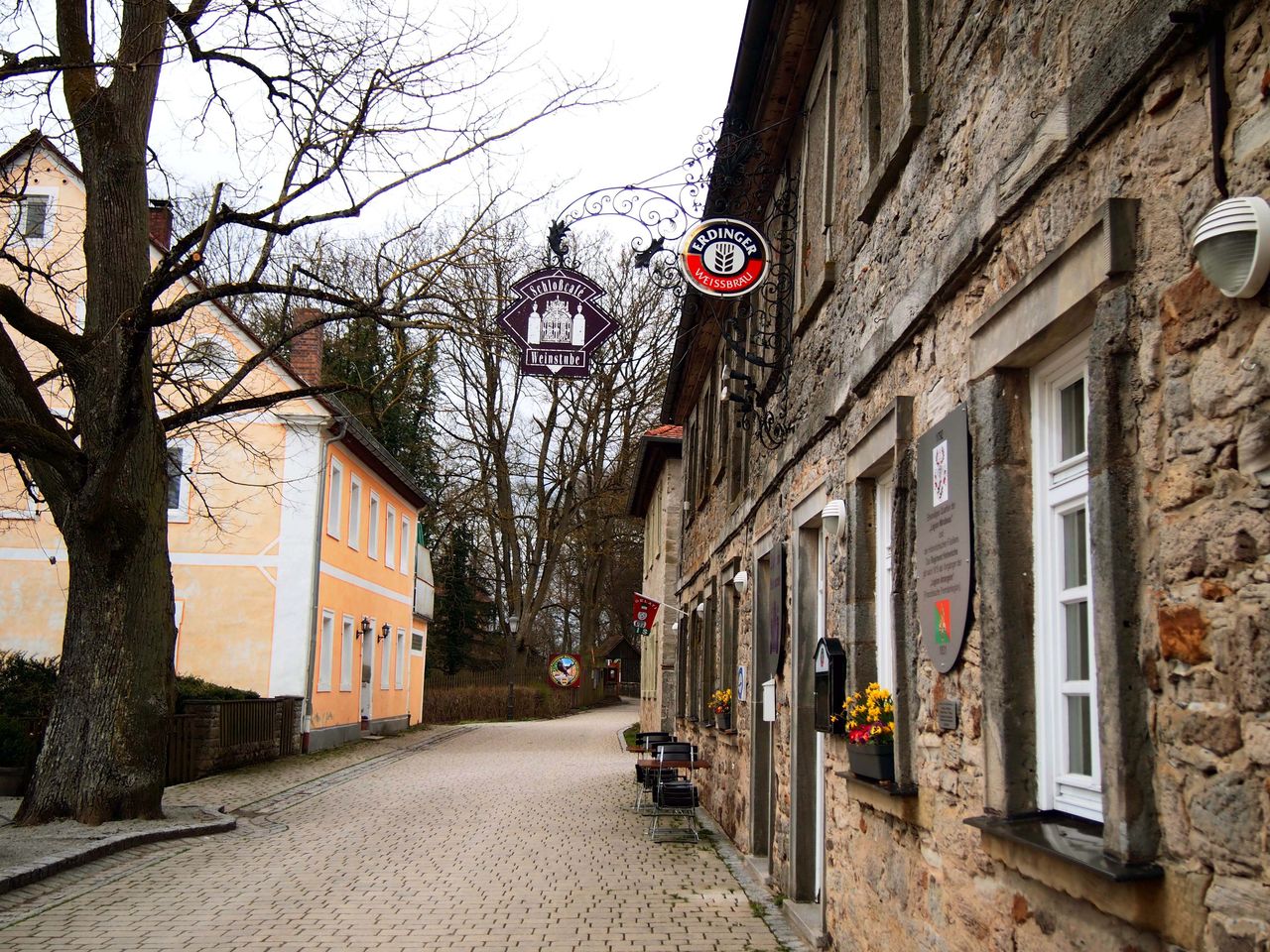 街の上まで登ると城に続く街道へ。レストランを越えて林に向かってお城へ。