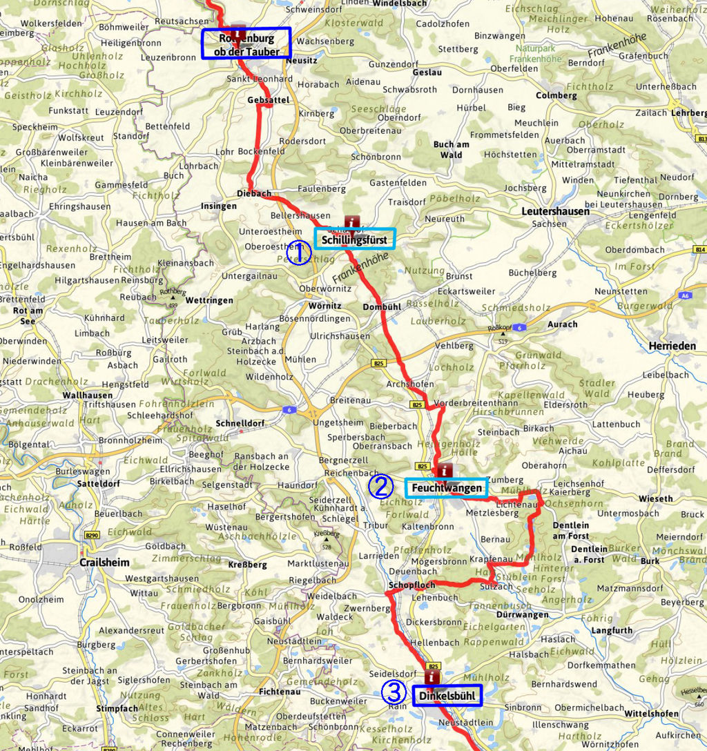 2016年4月頭、ローテンブルグ"Rothenburg ob der Tauber" 〜 ディンケルスビュール"Dinkelsbühl" 〜 ドナウヴェルト"Donauwörth" までを走ってみたので、この第3弾ではローテンブルグ〜ディンケルスビュールまでをご紹介。