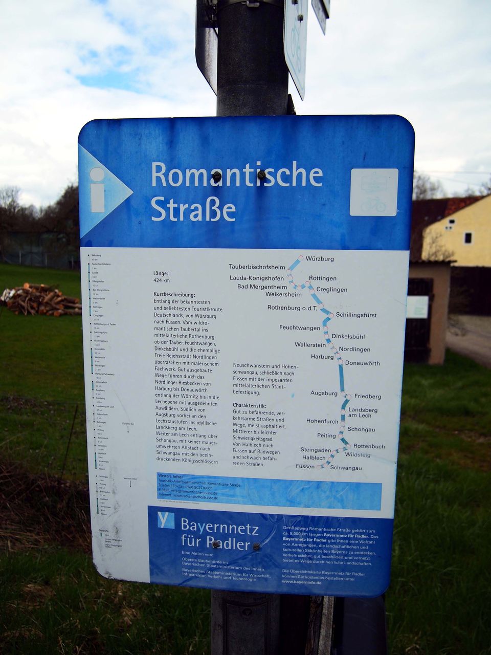 ちなみに、ロマンティック街道を自転車で走るときは、自転車道標識の下に付いているこの標識に注意。これが、ロマンティック街道の標識。色んな自転車道が入り組んでいるポイントでは特に注意が必要。