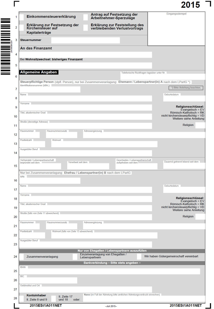 ページ内の "Einkommensteuer-Mantelbogen - ESt 1A" をダウンロード。こちら(PDFページへ)。