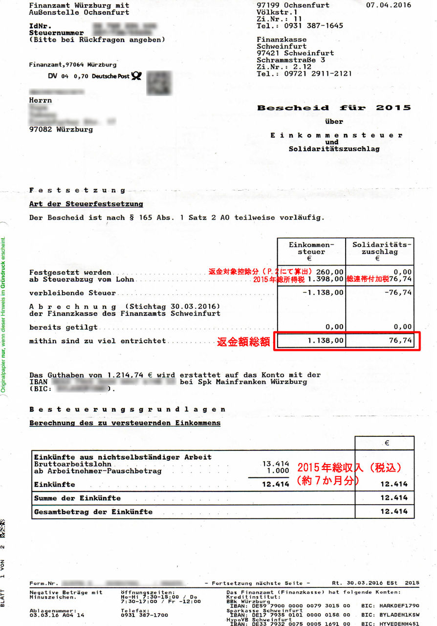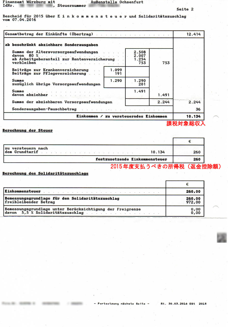 ・ 厳密には"Einkommensteuer : 所得税" と "Slidaritätszuschlag : 連帯付加税" が返金される。
