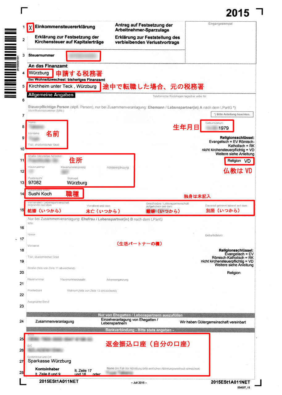 ・ 申請期限は、2015年分の申請は2016年3月末日まで。(ドイツニュースダイジェストには毎年5月末日まで、と書いてあるが(こちら)、、。。下の税務署の資料では3月末日となっている。。毎年前後するようなので都度確認が必要だけど、、どれが本当なのか??)