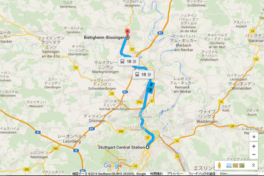 Googe Map¤Ï¤³¤Á¤é¡£Stuttgart¤«¤éS-Bahn¡Ê¶áµ÷ΥŴƻ¡Ë¤Ç25ʬ¡¢Regional Bahn¡ÊÅÔ»Ô´ÖÅ´Æ»¡Ë¤Ç18ʬ¤Û¤É¤Ë¤¢¤ë"Bietigheim-Bissingen Bahnhof ¡§ ¥Ó¡¼¥Æ¥£¥Ò¥Ï¥¤¥à ¡¦ ¥Ó¥Ã¥·¥ó¥²¥ó±Ø" ¤Ç²¼¼Ö¡£¡ÊDB¤Î¸¡º÷¥µ¥¤¥È¤Ï¤³¤Á¤é¡Ë¹ß¤ê¤ë¤È¤¹¤°¤Ë½»Â𤬹¤¬¤ëÃæ¡¢"Historische Altstadt" ¤È¤¤¤¦´ÇÈĤ˱è¤Ã¤ÆÊ⤤¤Æ¤¤¤¯¡£¤½¤³¤½¤³¤Î®¤µ¤ÇÊ⤤¤Æ¤À¤¤¤¿¤¤20Ê¬Äø¤Ï¤«¤«¤ë¤À¤í¤¦¤«¡£