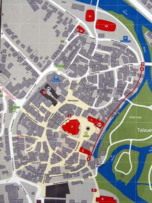 ÃϿޤ΢¤¢¤¿¤ê¡£³¹¤ÎÃæ¿´¤Ç¤¢¤ë¥Þ¥ë¥¯¥È¹¾ì¡£ÀÖ¤¤Â礤ʷúʪ¤Ï¸½Ìò¤Î "Rathaus¡§»ÔÌò½ê" ¡£ÆüÍËÆü¤ÎÁᤤ»þ´Ö¤À¤Ã¤¿¤Î¤Ç¡¢´×»¶¤È¤·¤Æ¤¤¤ë¤±¤É¡¢Fachwerkhaus¤Ë°Ï¤Þ¤ì¤¿ÀŤ«¤Ê¶õ´Ö¤Ï¤È¤Æ¤â¿´ÃϤ褤¾ì½ê¤À¤Ã¤¿¡£