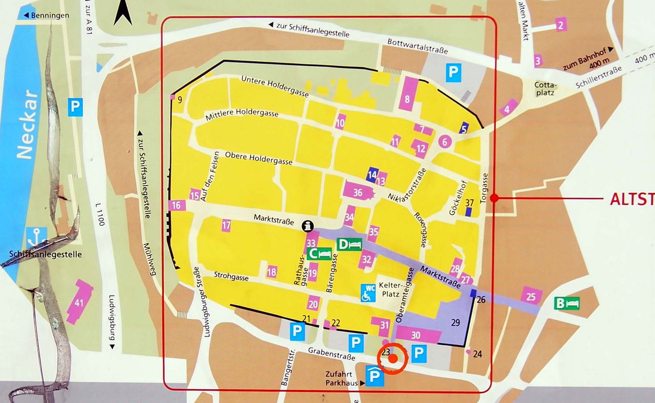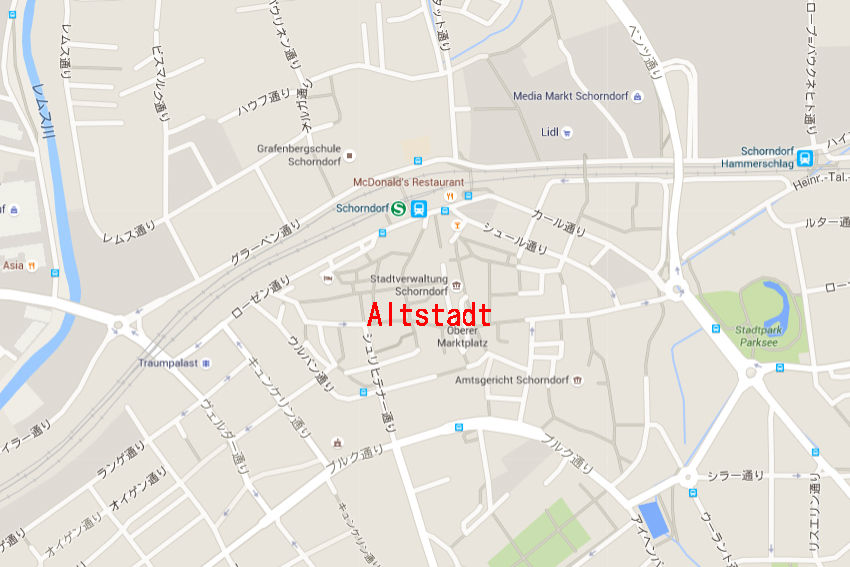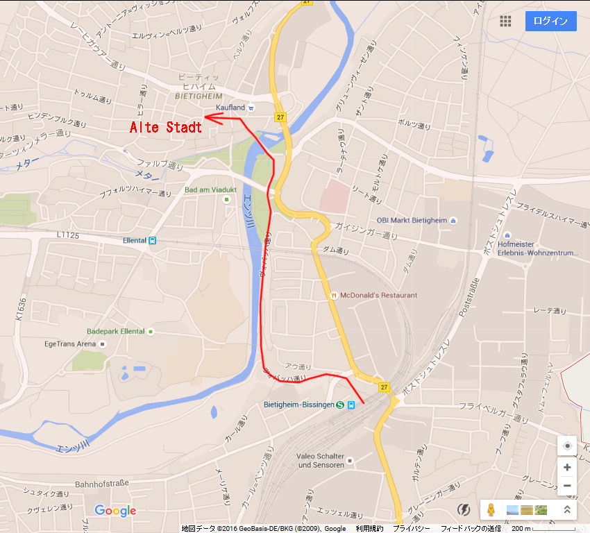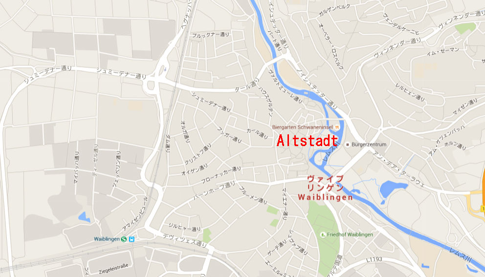 Google map ¤Ï¤³¤Á¤é¡£Stuttgart¤«¤éRegional Bahn¤â¤·¤¯¤ÏS-Bahn¤Ç10ʬ¤Á¤ç¤Ã¤È¤ÇÅþÃå¡£±Ø¤«¤éµì»Ô³¹¤Þ¤Ç¤Ï¾¯¤·Î¥¤ì¤Æ¤¤¤ë¤Î¤Ç¡¢¤Î¤ó¤Ó¤ê»¶Êâ¡£¤³¤³¤â¡¢ÃϿޤǸ«¤ë¤Èµì»Ô³¹¤Î·Á¤¬¤Ï¤Ã¤¤ê¤ÈÆÉ¤ß¼è¤ë¤³¤È¤¬½ÐÍè¤ë¡£¸µ¡¹ÊɤǰϤޤ줿³¹¤Ç¡¢Àî±è¤¤¤òÃæ¿´¤ËÊɤ¬»Ä¤Ã¤Æ¤ª¤ê¡¢Êɤξå¤ò°ìÉôÊ⤯¤³¤È¤â½ÐÍè¤ë¡Ê3ËçÌÜÃϿޤÎÀÖ¤¤¥é¥¤¥ó¡Ë¡£