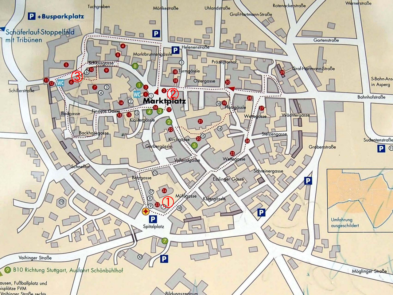 Google map ¤Ï¤³¤Á¤é¡£Stuttgart¤«¤éS-Bahn¤Ë¾è¤ê18ʬ¡¢"Asperg ¡§ ¥¢¥¹¥Ú¥ë¥°" ²¼¼Ö¡£¤½¤³¤«¤é¥Ð¥¹¤Ë¾è¤Ã¤Æ10ʬ¼å¤Û¤É¤Çµì»Ô³¹¤Îü¤ËÅþÃ夹¤ë¡£2ËçÌÜÃϿޤò¸«¤ë¤È¡¢µì»Ô³¹¤¬°ìÌÜÎÆÁ³¤Î·Á¡£ÀΤϴݤ¯ÊɤǤ«¤³¤Þ¤ì¤Æ¤¤¤¿¤é¤·¤¤¡£¤³¤ÎÃϿޤÎÅÀÀþ¤¬»¶ºö¥ë¡¼¥È¡£¤³¤³¤Ç¤Ï¤½¤ÎÃæ¤Ç¤âÊ·°Ïµ¤¤ÎÎɤ«¤Ã¤¿¡¡¢¢¡¢£¤ò¾Ò²ð¤·¤Æ¤ß¤¿¤¤¡£