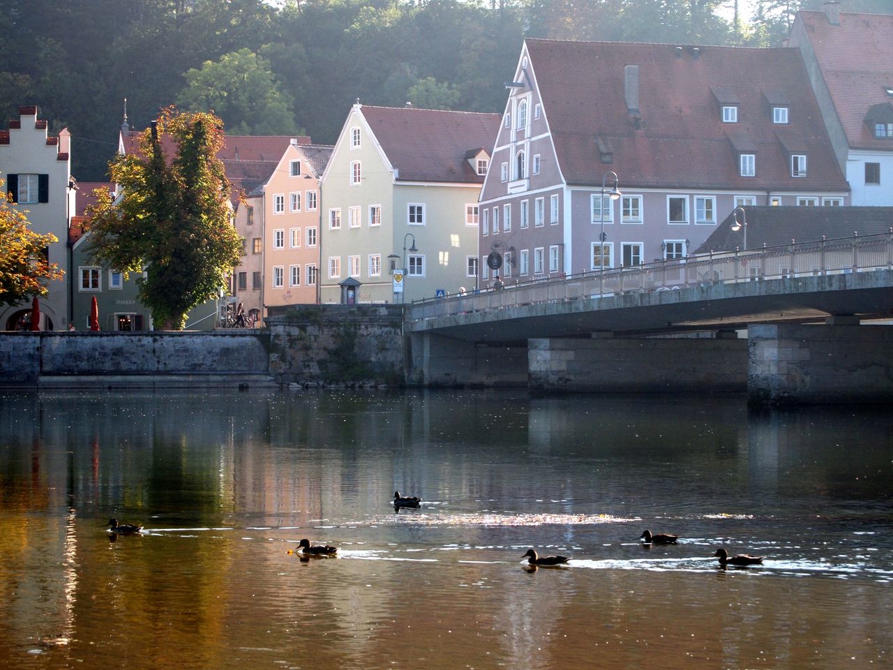 Lech川越しに見た街の様子。水面に映る建物やLech川と空、緑のコントラストも素晴らしい。