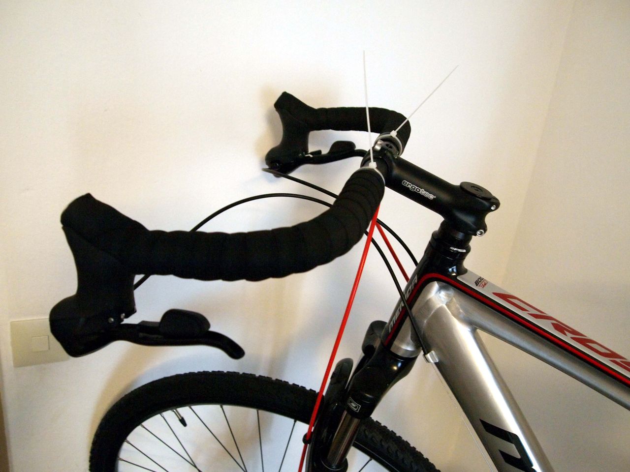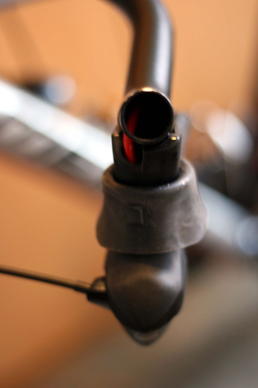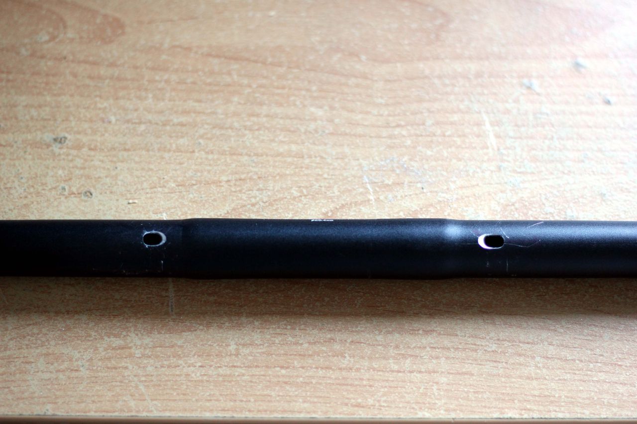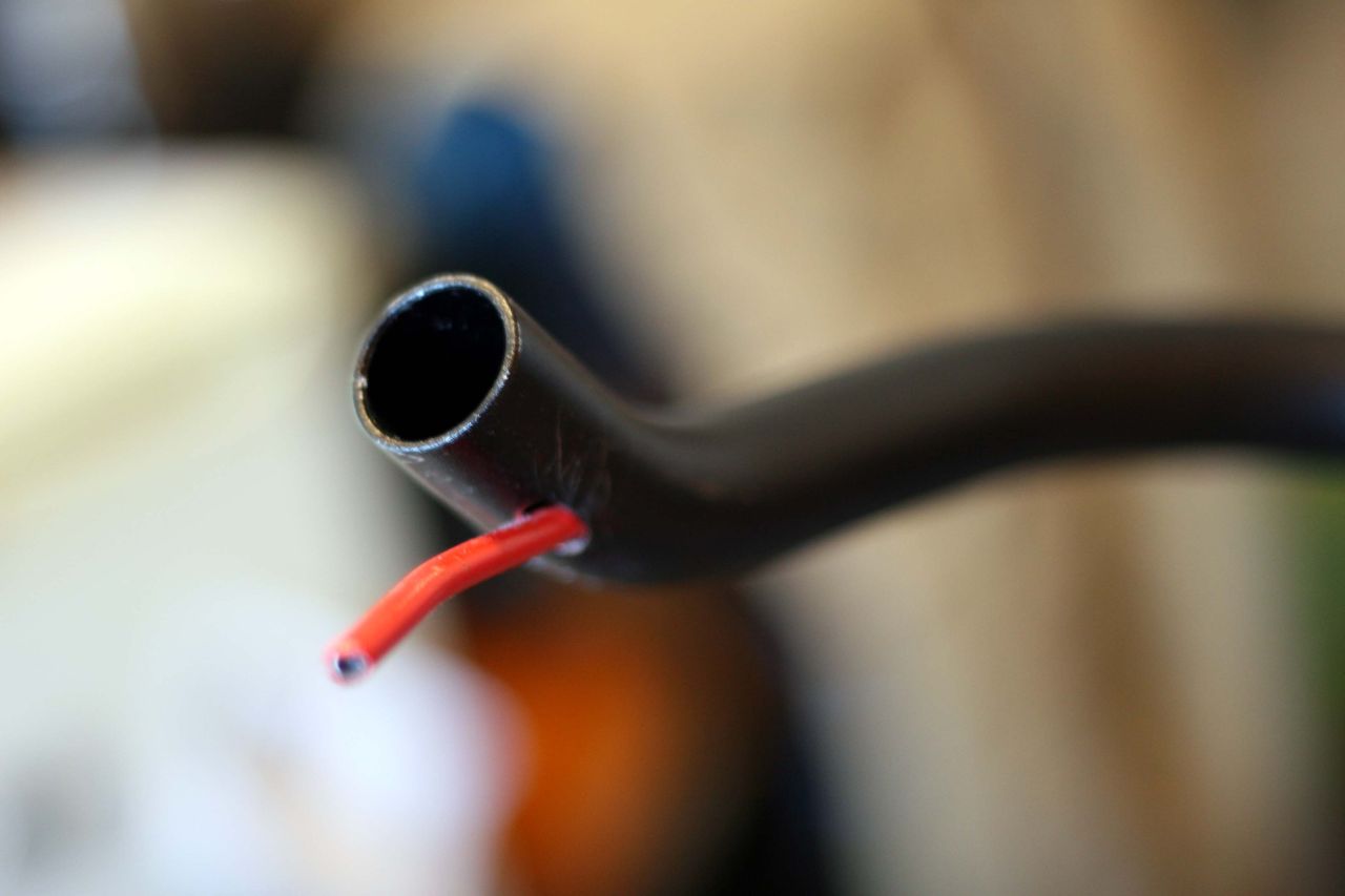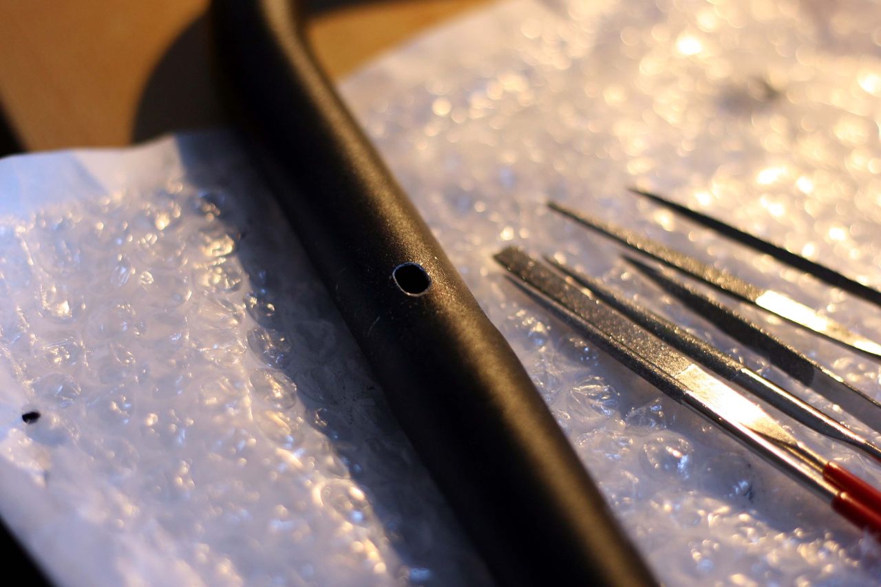 ハンドルをブルホーン化しSTIブレーキを使用する場合、問題となるのがブレーキケーブルの取り回し。ハンドルテープで包んでしまう方法も一般的だが、よりすっきりさせたいためにハンドルにケーブル用の穴をあけて中を通す事にした。