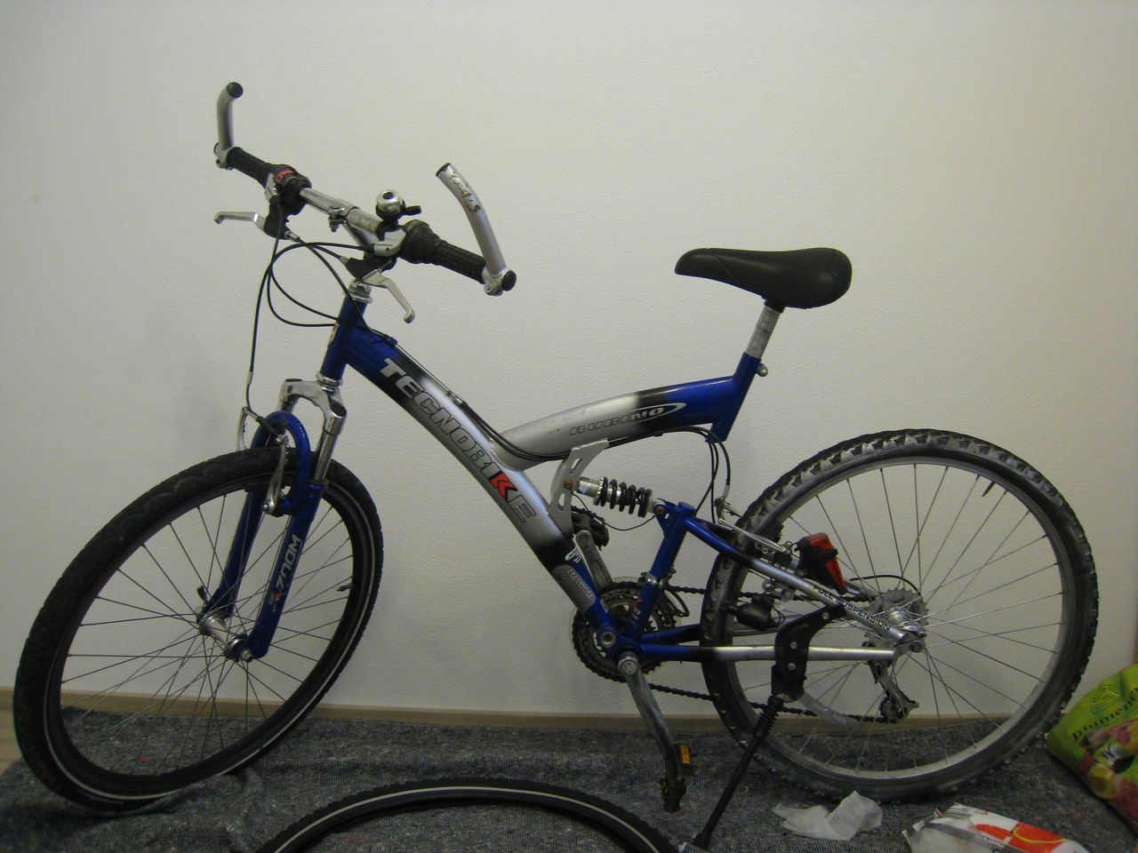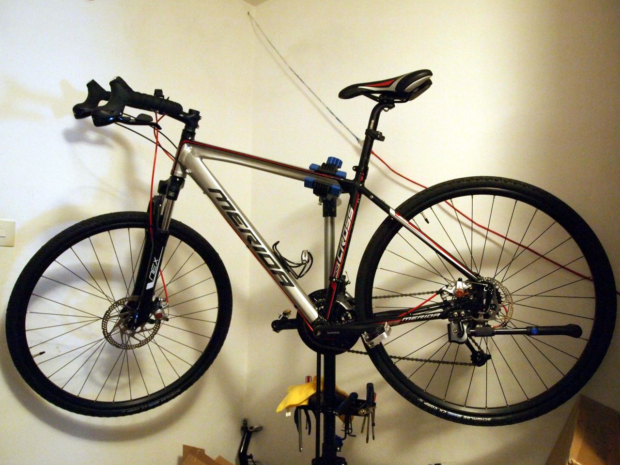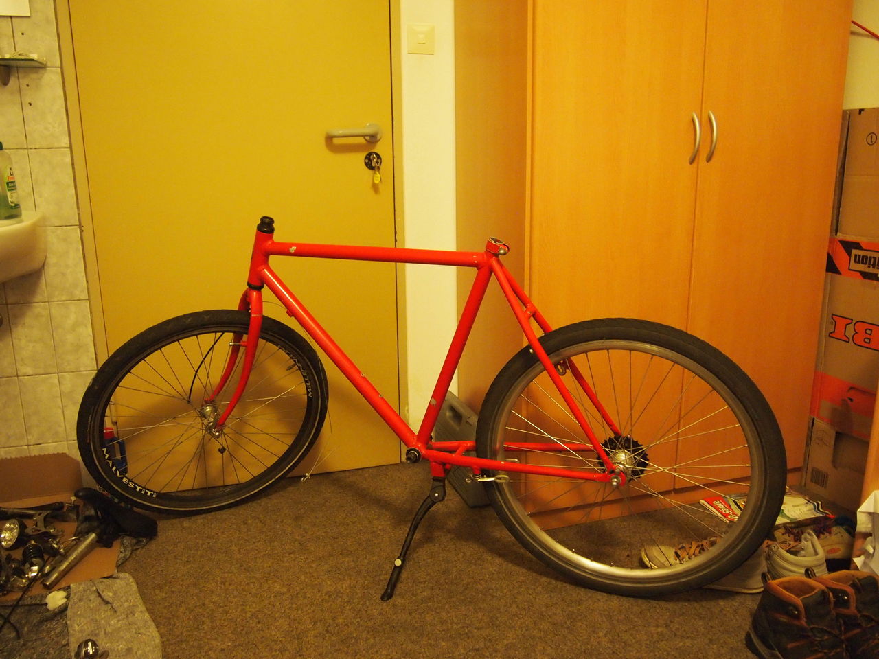 自転車の組み立ては全部部屋です。部屋はWGで7畳くらいしかないので、手狭な中でやってます。。なので、写真の中にもありますが、自転車用のスタンドを持ってます。そうすると、スペースをうまく使えて便利です。e-bayで30EURくらいで売ってますのでお勧めです。