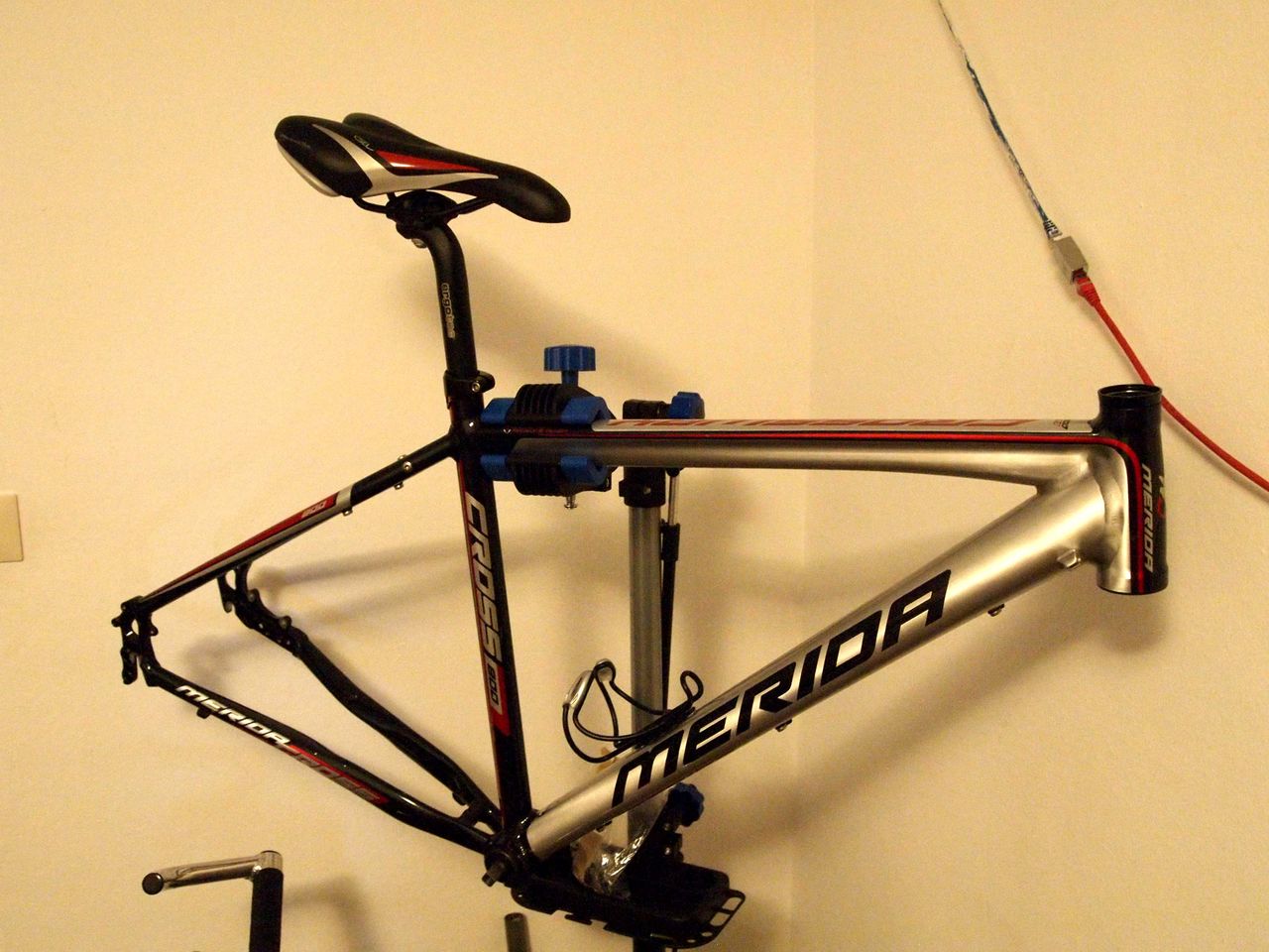 しばらく探していて、たまたま出品されたのが「Merida : メリダ」のクロスバイクフレーム。もちろん少し前のモデルだし、フロントサス付きなので重いのがネックだけど、、状態も非常に良さそうだし、色合いも好きなので、こちらで即決。