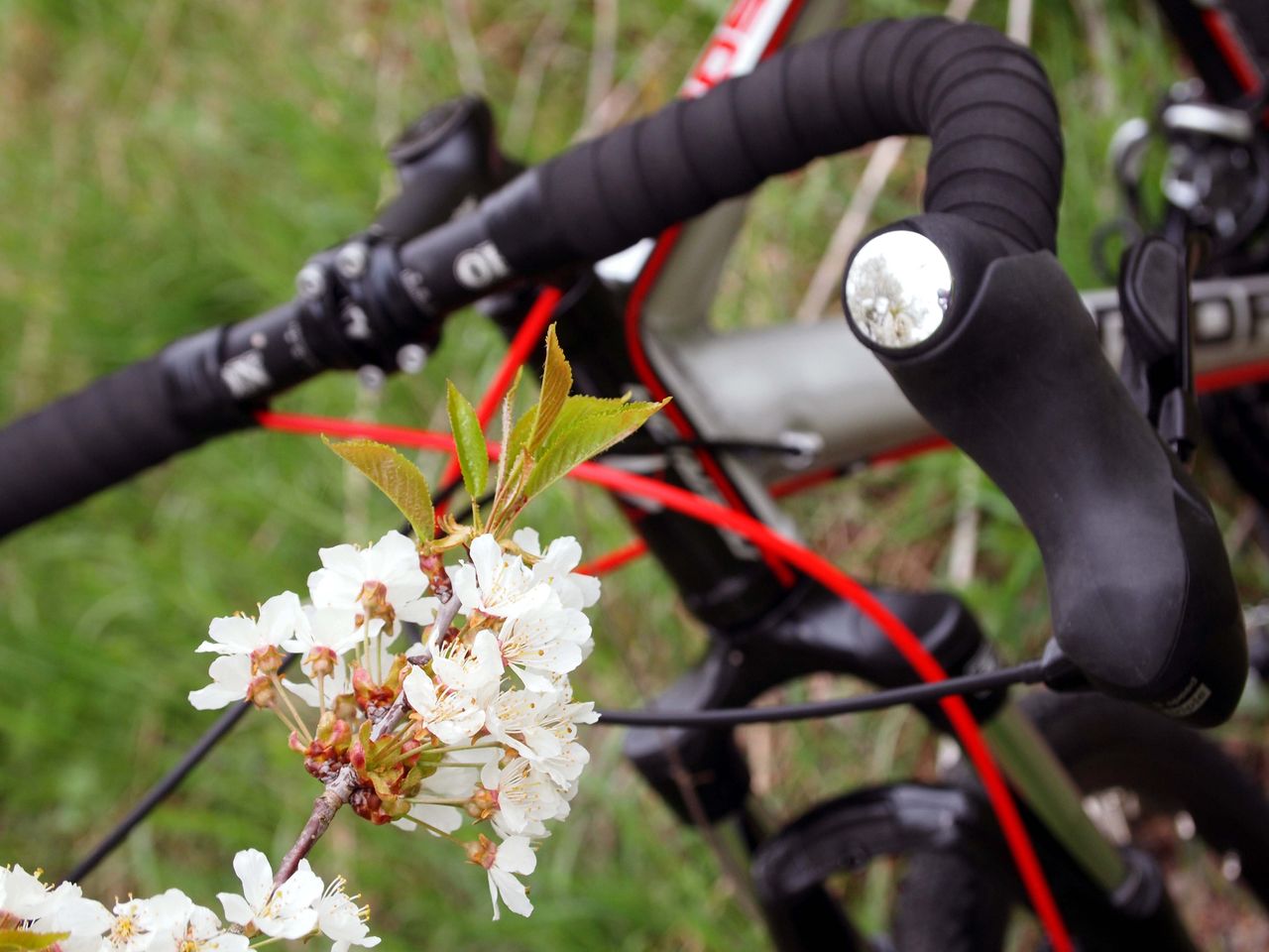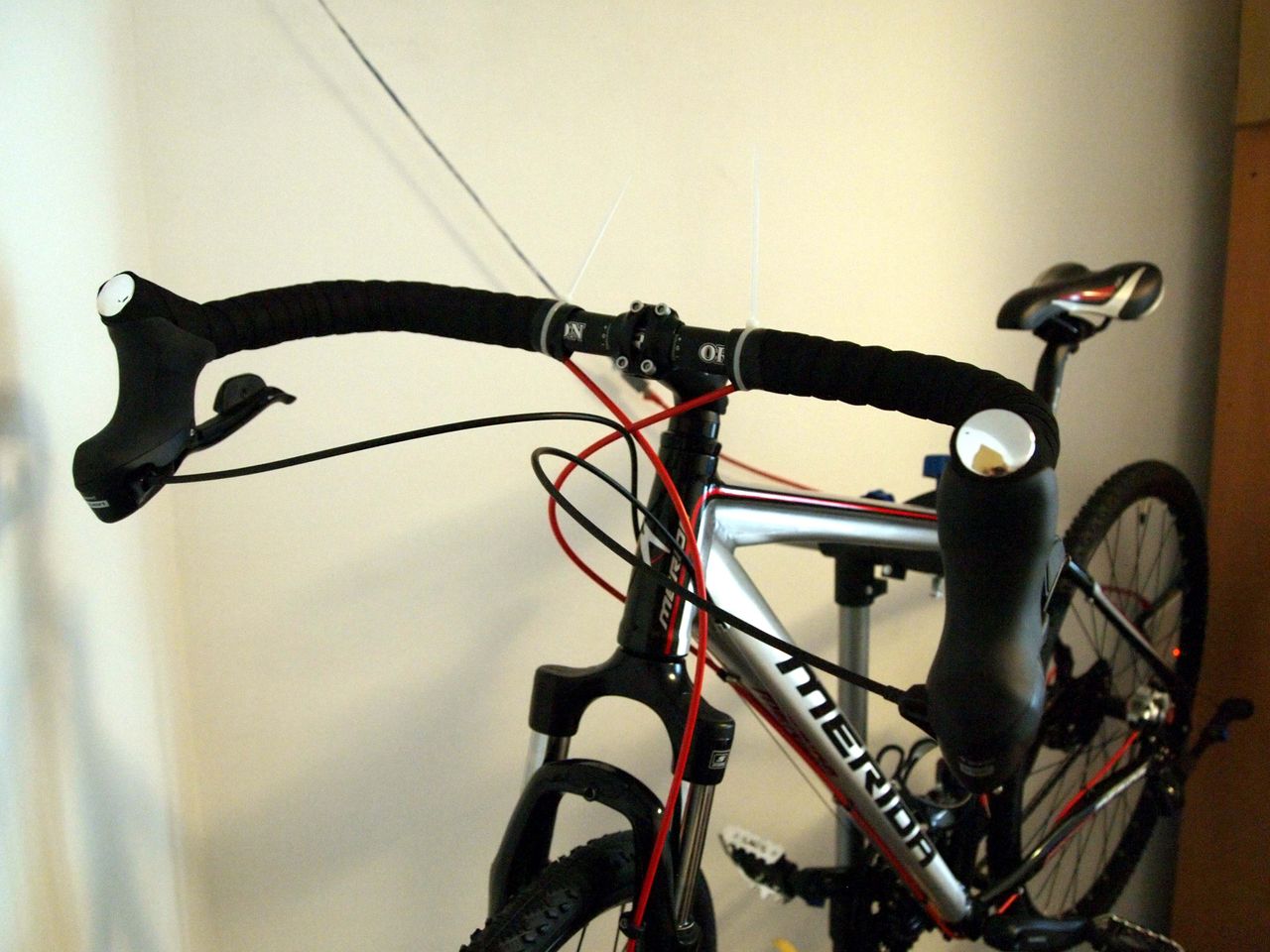 完成写真。(なお、中央部の結束バンドは一時的なもの。ハンドルテープの端を止めるビニールテープの粘着を安定させるために一晩固定。)
