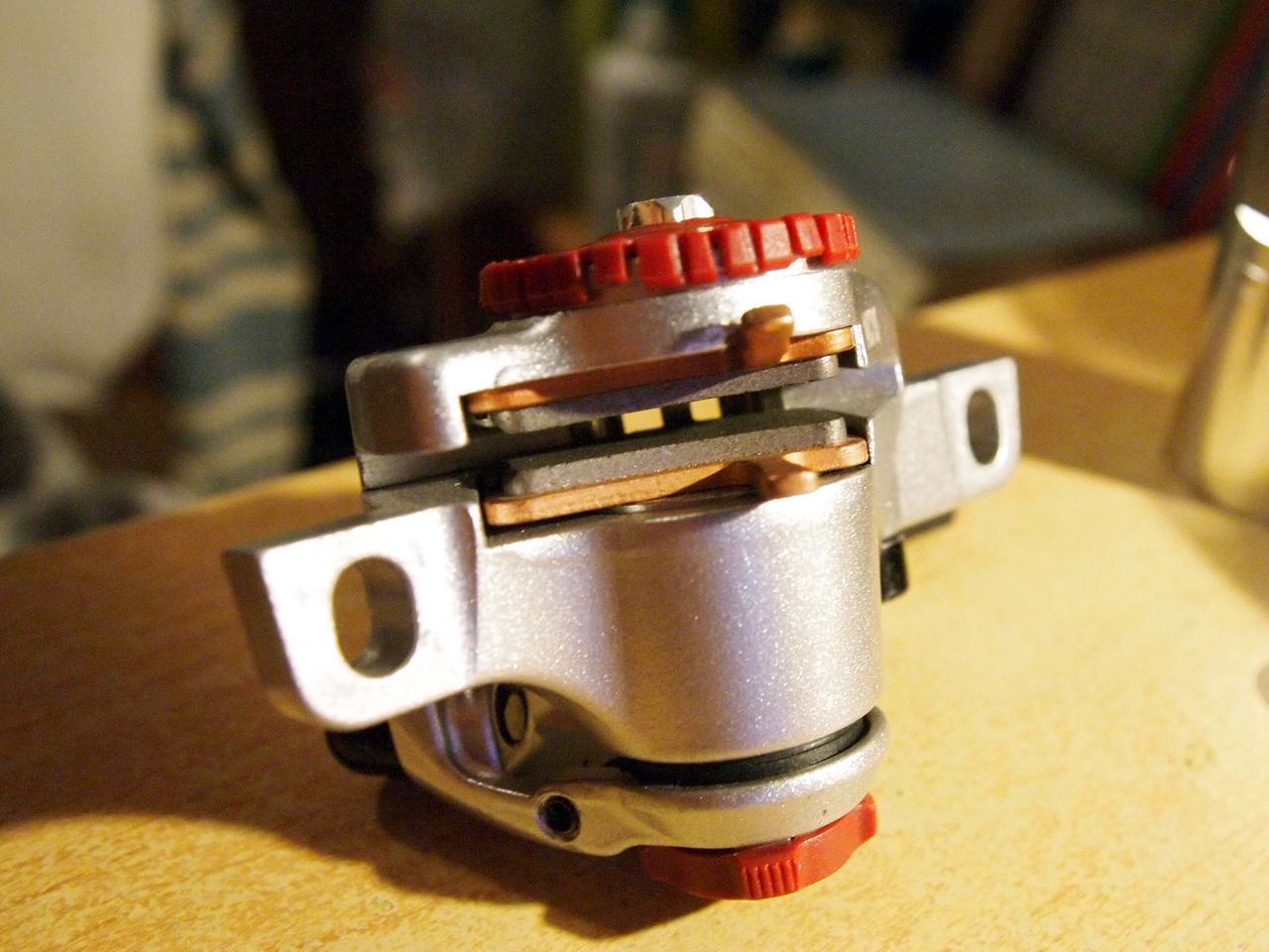構造を確認しながら、カチッとするところまでしっかり取付。Avid BB7は両方のパッドを調整することが出来る。赤いダイヤルを回してブレーキパッドの動きを確認しておくと良い。