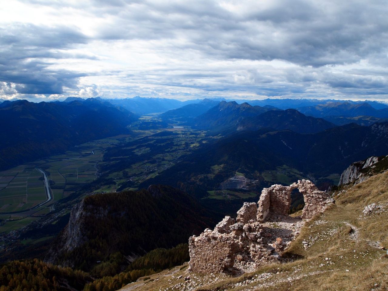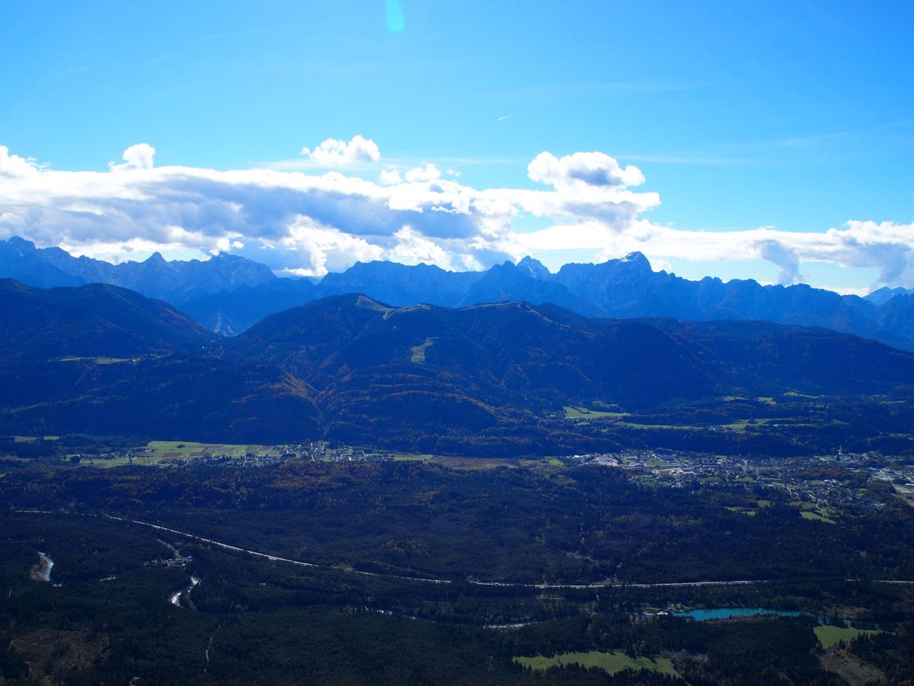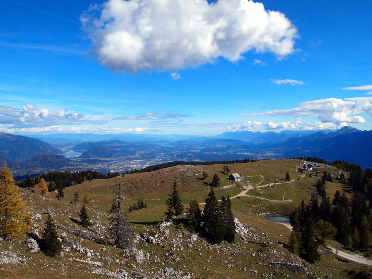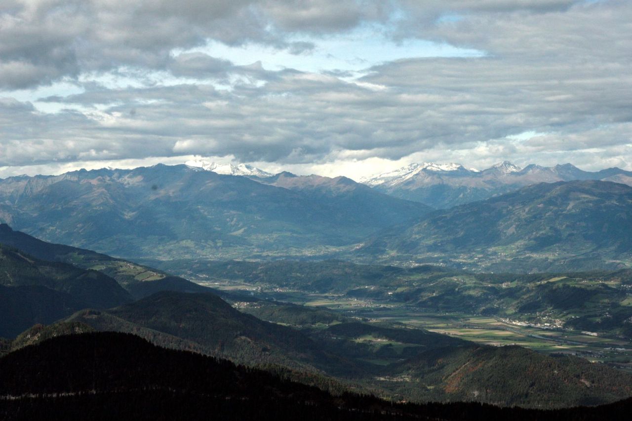 山頂までの間にいくつものみはらしポイントがあり、フィラッハを眼下に綺麗な山岳景色が見え、南はイタリアやスロベニアとの国境にそびえる山々が見えて美しい。
