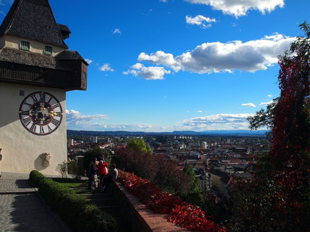 高台に建つ街のシンボル、時計塔。茶色い屋根が眼下に広がり、遠くにはアルプスの山々も。