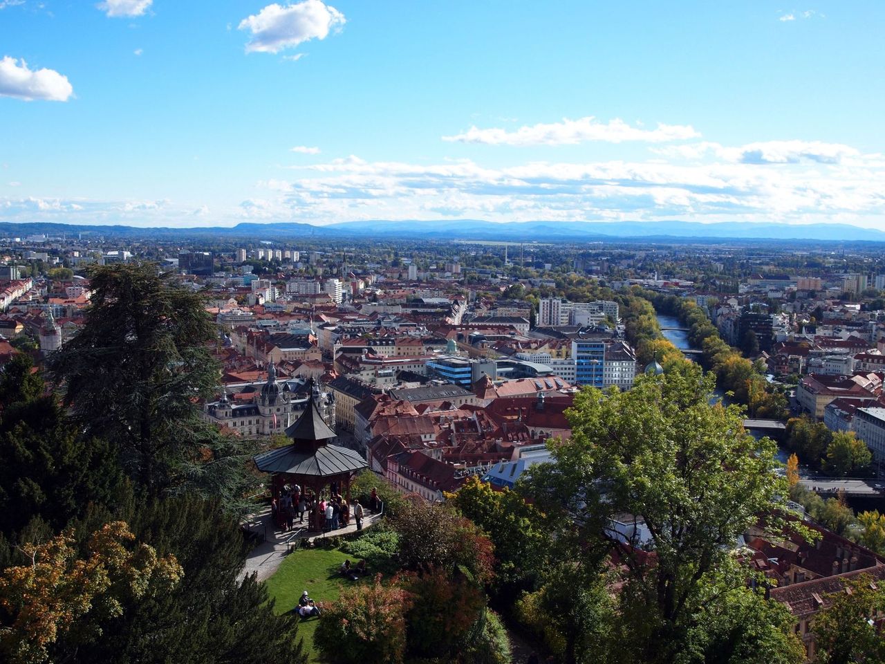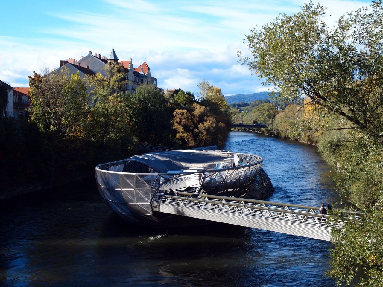 街の中心に流れるムール川。街の配置的には、南ドイツのチュービンゲンにも似ている。街にはアートが散見され、川にはガラス張りのカフェがあったり。
