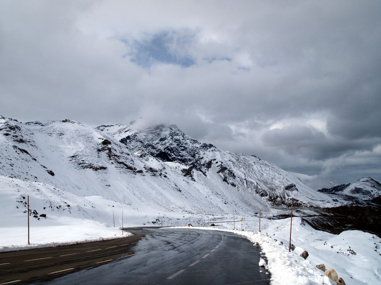 どんどん近くなる雪をまとった山肌。真夏はかなりの交通量らしいが、この時期は車も少なく、ゆっくりと景色を楽しみながらの運転。しっかしものすごい景色である。。