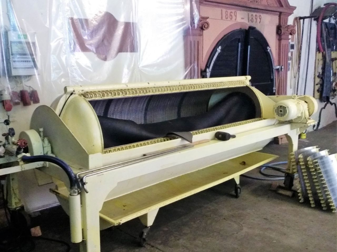 こちらのプレス機は、Hamm醸造所にある小さなタイプ。自動のプレス機にはタイプがいくつかあるけど基本的な構造は、この筒の中心部にゴムチューブが入っていて、空気で膨らませて壁との間でブドウが潰される、と言う仕組み。2枚目が昔ながらの手動タイプのプレス機。