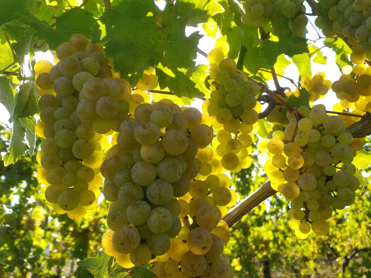 白ブドウの品種はリースリング、黒ぶどうはシュペートブルグンダー(ピノ・ノアール)。特にリースリングは太陽光を通して黄金に!