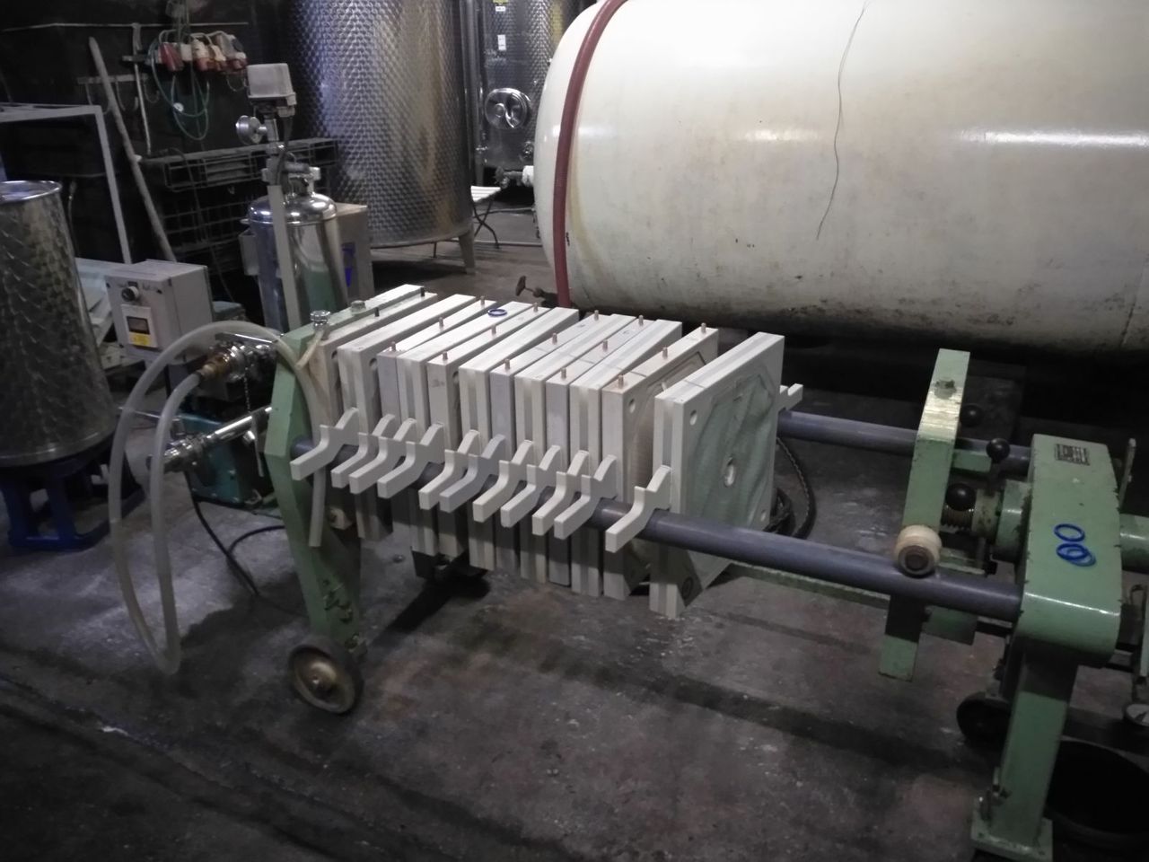 1枚目は、温度管理が出来る槽でろ過の準備を行う。ブドウ果汁(モスト)にろ過を助けるパーライトを添加し攪拌。その後に、写真2枚目の多層フィルターへ送り込む。