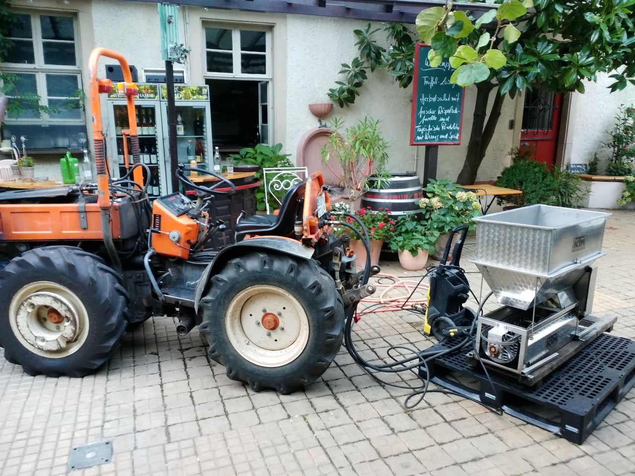 ブドウの粒を取り外す作業(マイシュ;Maischen)をするものもあれば、房のままプレス機に投入するものもある。