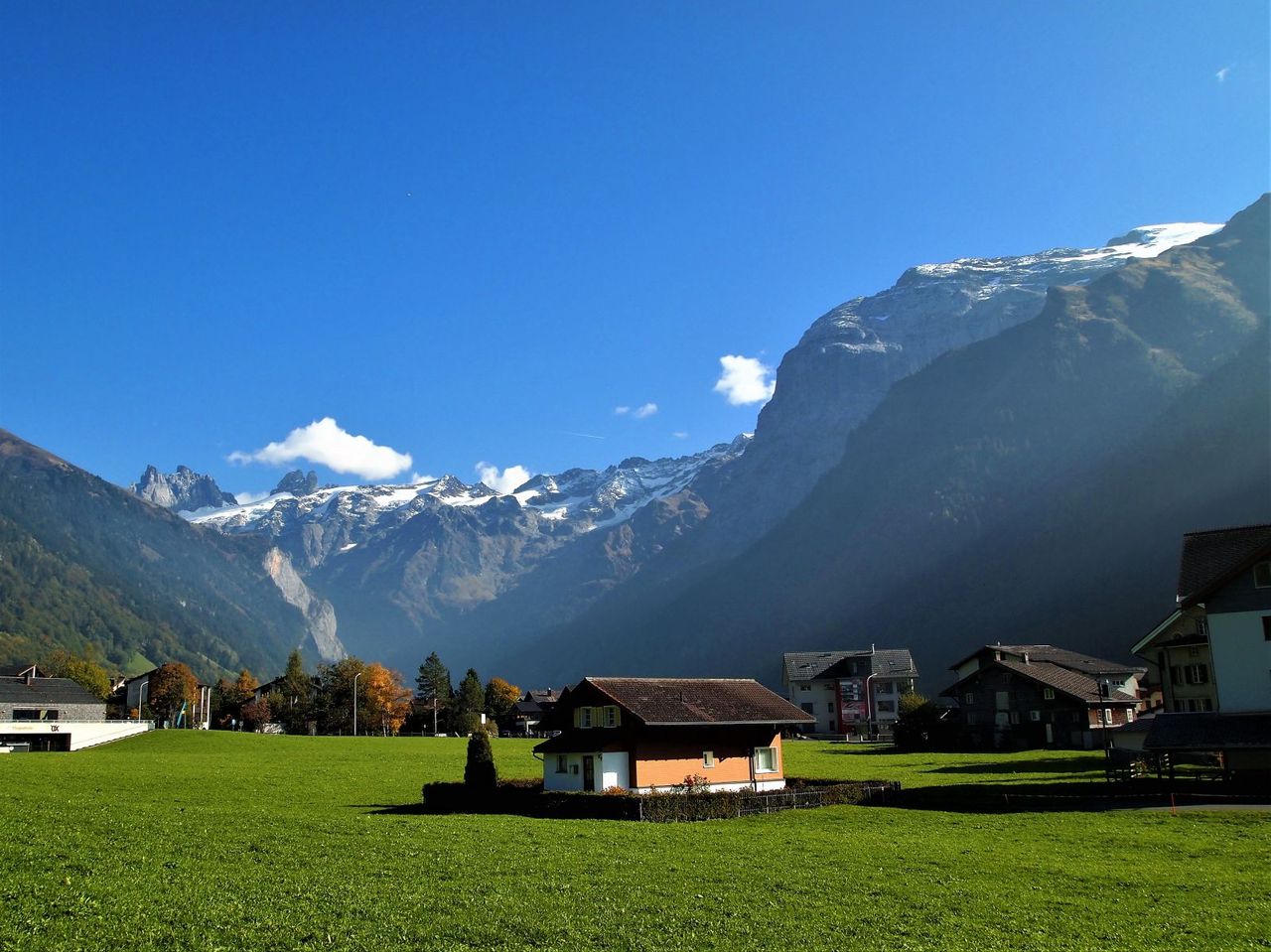 360度山に囲まれたエンゲルベルグ。街中にはたくさんのホテルが立ち並び、少し外れると草原も広がる。2枚目の右側にそびえている山がティトリス山で、3238m。麓からでも氷河があることがわかるが、ロープウェイとケーブルカーで山頂近くまで登ることも可能。今回はユングフラウの登山鉄道を優先したが、ここもいつかは上まで行ってみたいものである。