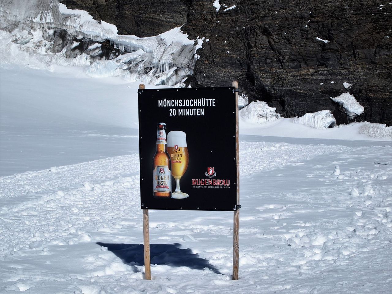 そして面白かったのがこれ。メンヒの山小屋を目指していると、時折こんな看板が。。「メンヒヒュッテまで20分。」なんだけど、つまり、あと20分頑張ったらビールが飲めるよ、っていう看板。確かに水より頑張れるか。。。