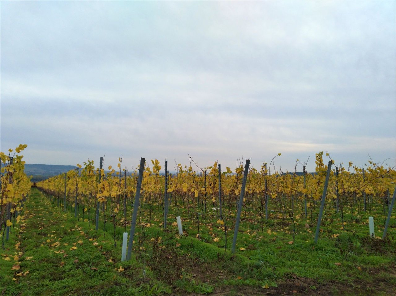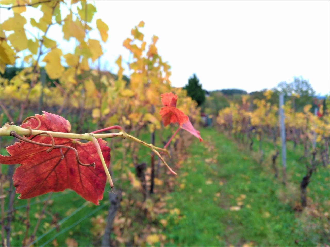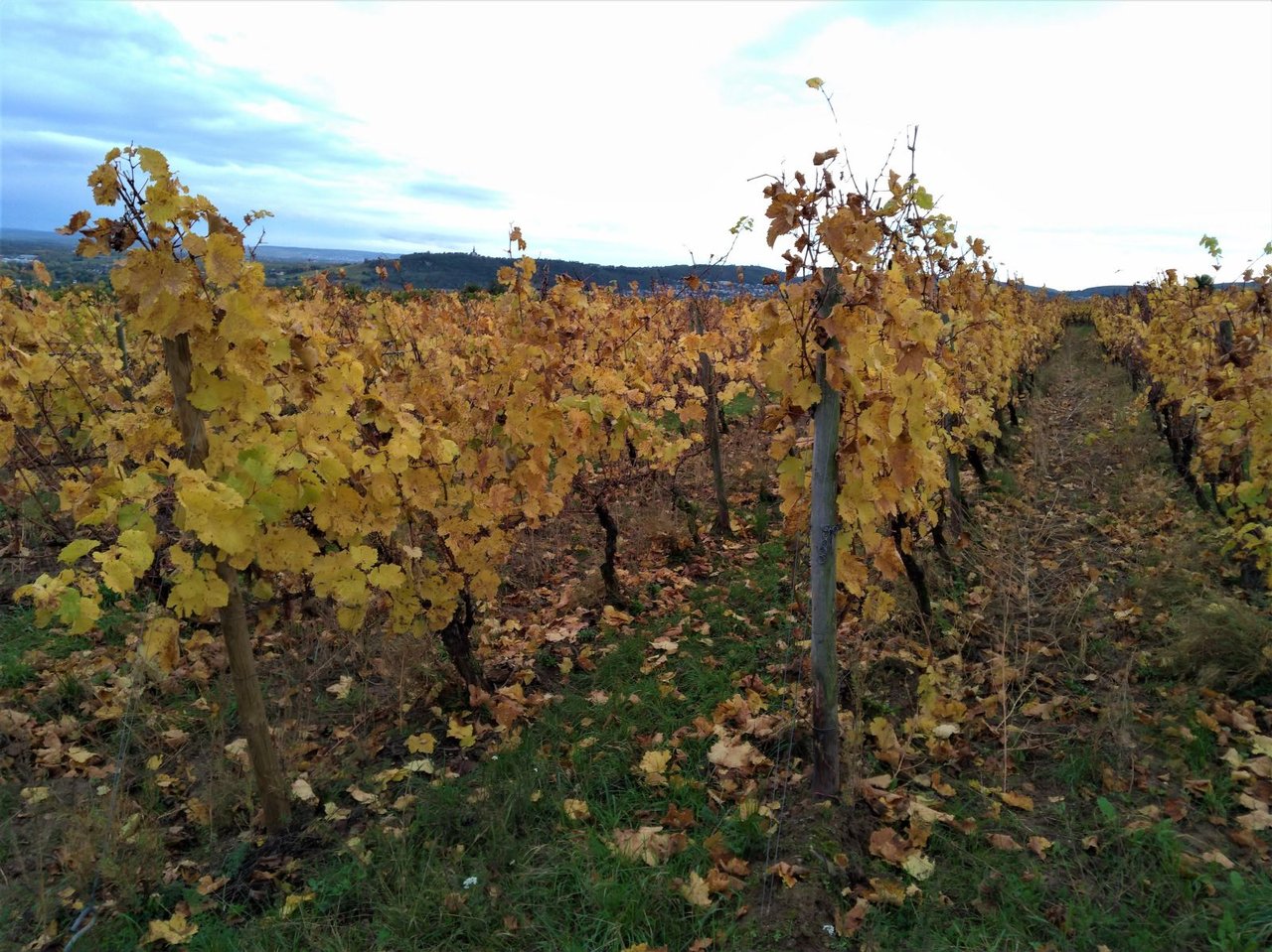 冬時間になったとたん、朝の冷え込みは0℃近くまで下がるなど、一気に冬の様相を呈してきた最近。ブドウ畑の紅葉も艶やかさがなくなって見頃も終わり。平均すると50%くらいが落葉している。