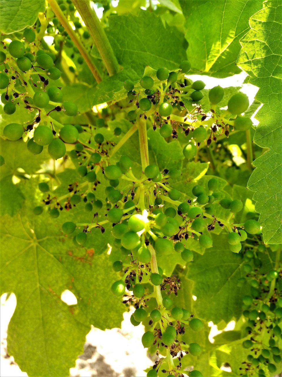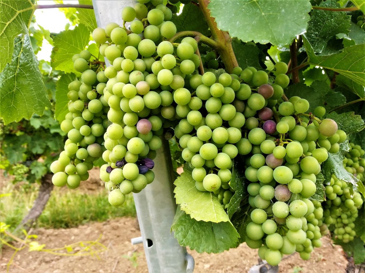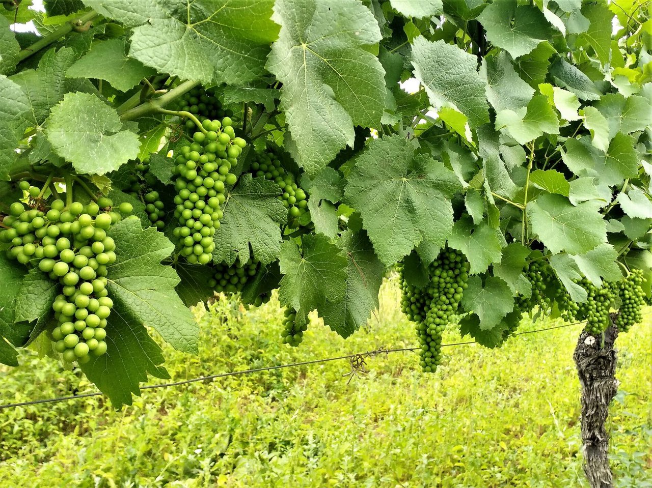 花が落ち、果実が大きくなり始めている。ここから1か月ほどかけて粒が大きくなり、その後に熟成期へ移っていく。枝もどんどん伸びていて、そろそろ成長点(枝の先端)をカットするブドウ畑も出てくるだろう。